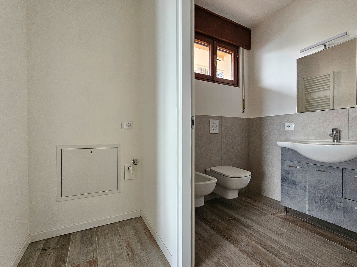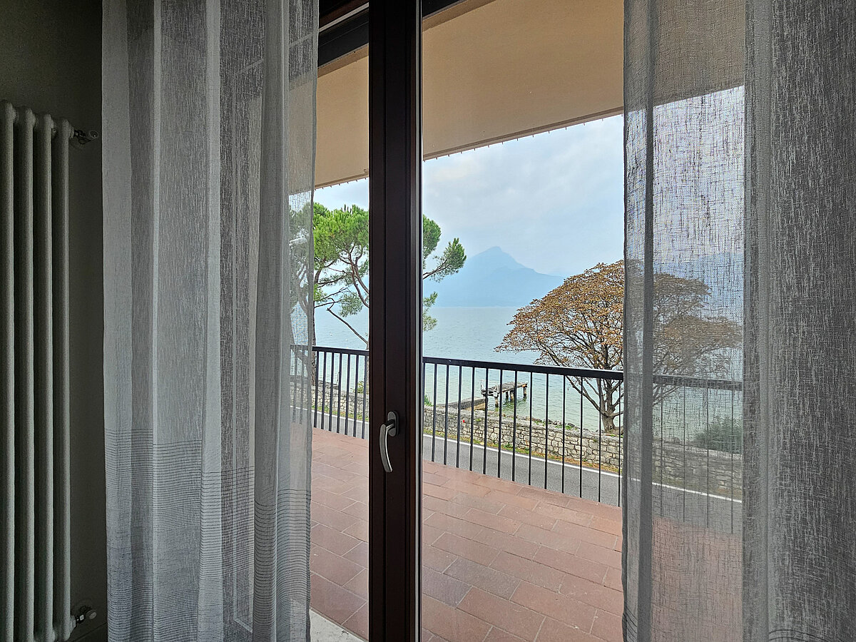 A highlight of the apartment is the large panoramic terrace, ideal for outdoor dining and relaxation, offering a charming view of the lake.