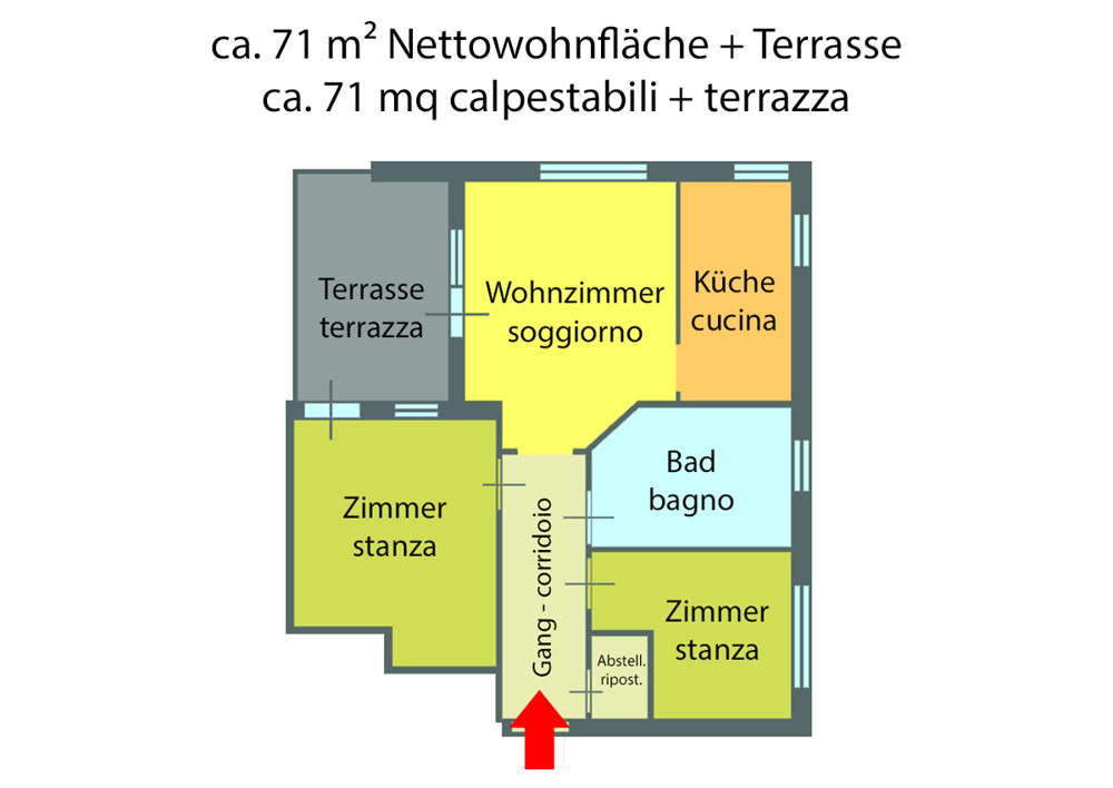 This charming 3- to 4-room apartment is for sale in an attractive location in Lana, directly on Johann-Tribusplatz. The property is internally oriented in a well-kept apartment building from 2000 and complies with the Klimahaus standard E. The apartment has a net living area of approx. 70 m² and offers two bedrooms, a living room, a separate kitchen, a hallway, a practical storage room and a bathroom with window, bathtub, shower, WC and bidet.