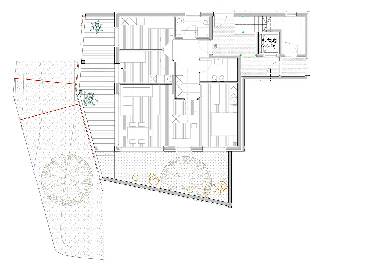 The building will be constructed in 2025 and meets the latest standards for modern living. An elevator is available to make access to the apartments convenient and barrier-free. Garage parking spaces on the lower first floor can be purchased separately as an option.