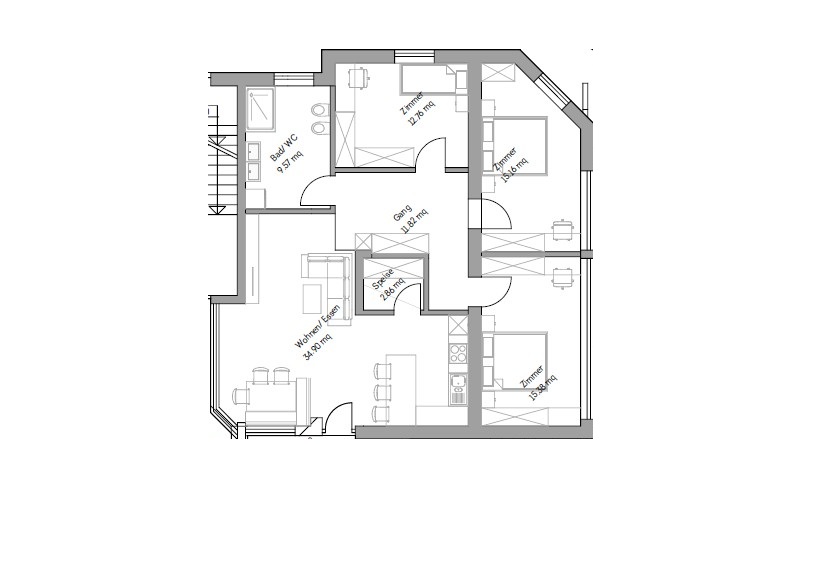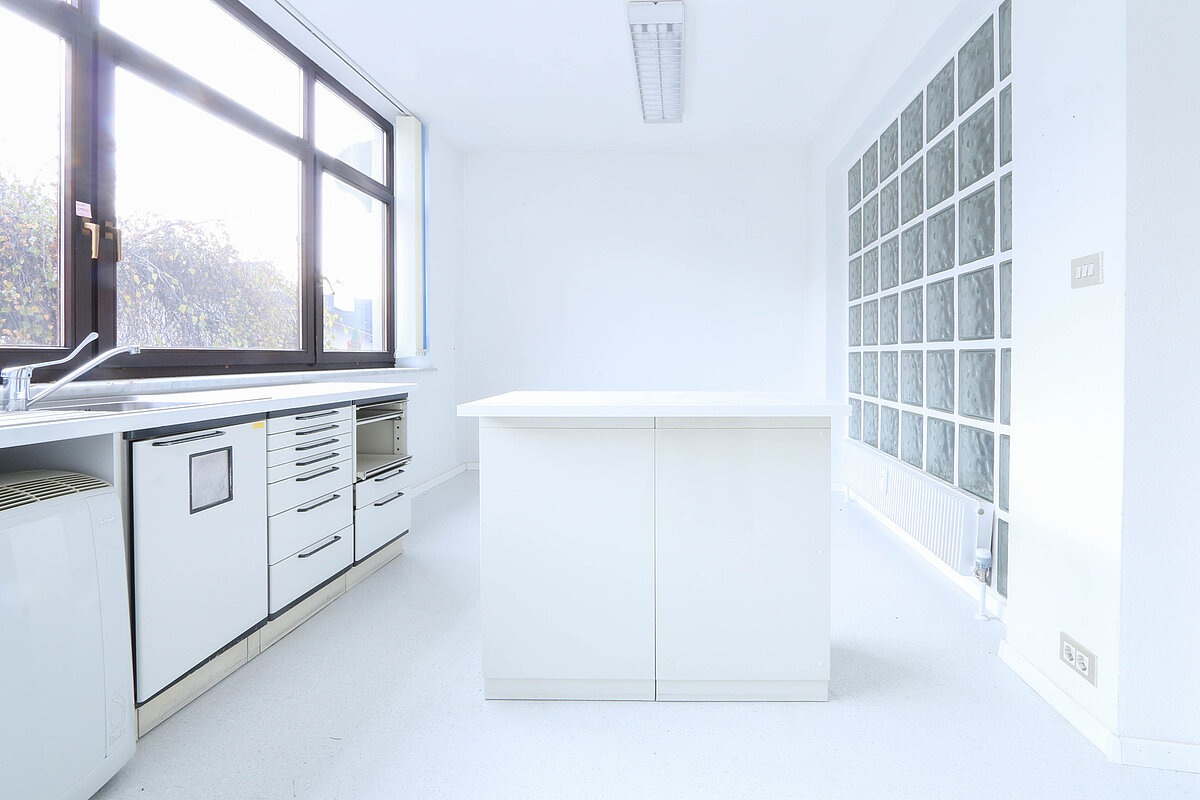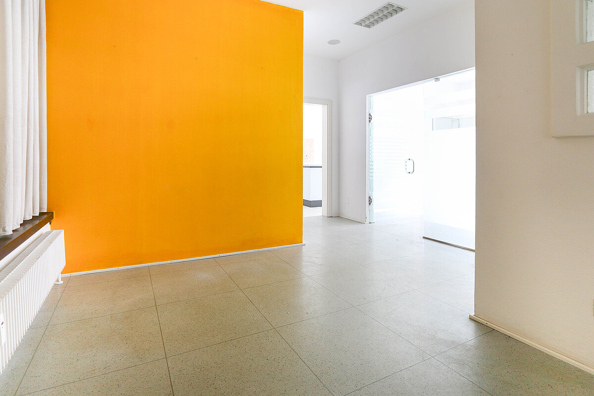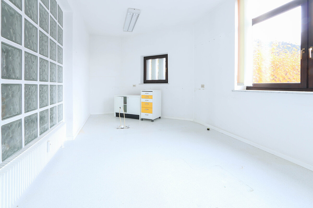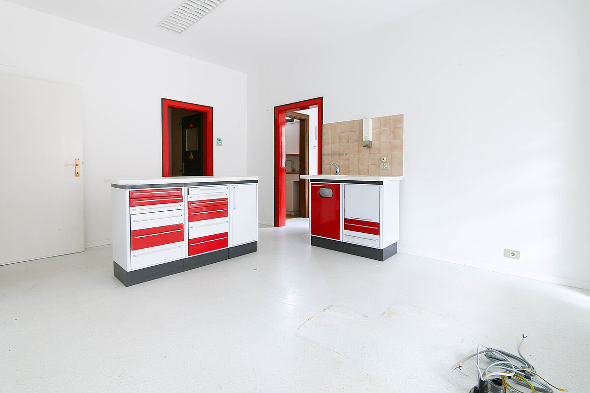 The result is an ideally suited staff apartment with a communal kitchen in the entrance area and three large bedrooms with bathroom. This layout can still be individually rearranged to suit your requirements. There is a garage parking space in the basement.