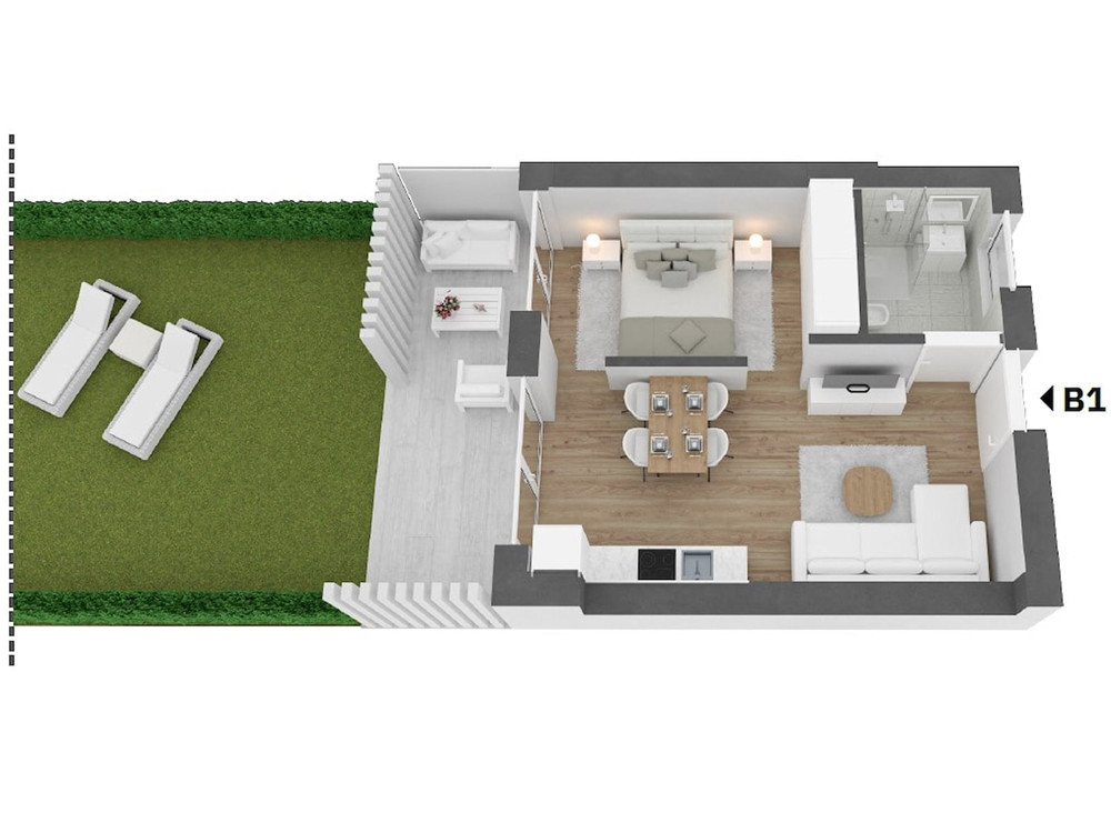 ROOM DIVISION: Cleverly designed living/sleeping area, bathroom, private terrace with garden, cellar