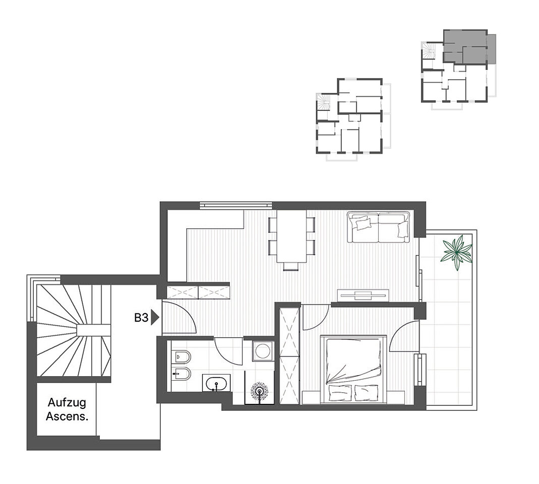 Two-room apartment on the 1st floor with south-facing balcony. This small but nice apartment with approx. 42 square meters is easily accessible by elevator. It has a bedroom, a bathroom and a cozy living/dining area with direct access to the south-facing balcony. There is a cellar compartment in the basement for additional storage space. A garage parking space can be purchased separately for €32,000. The property is free and can therefore also be used as a vacation home.