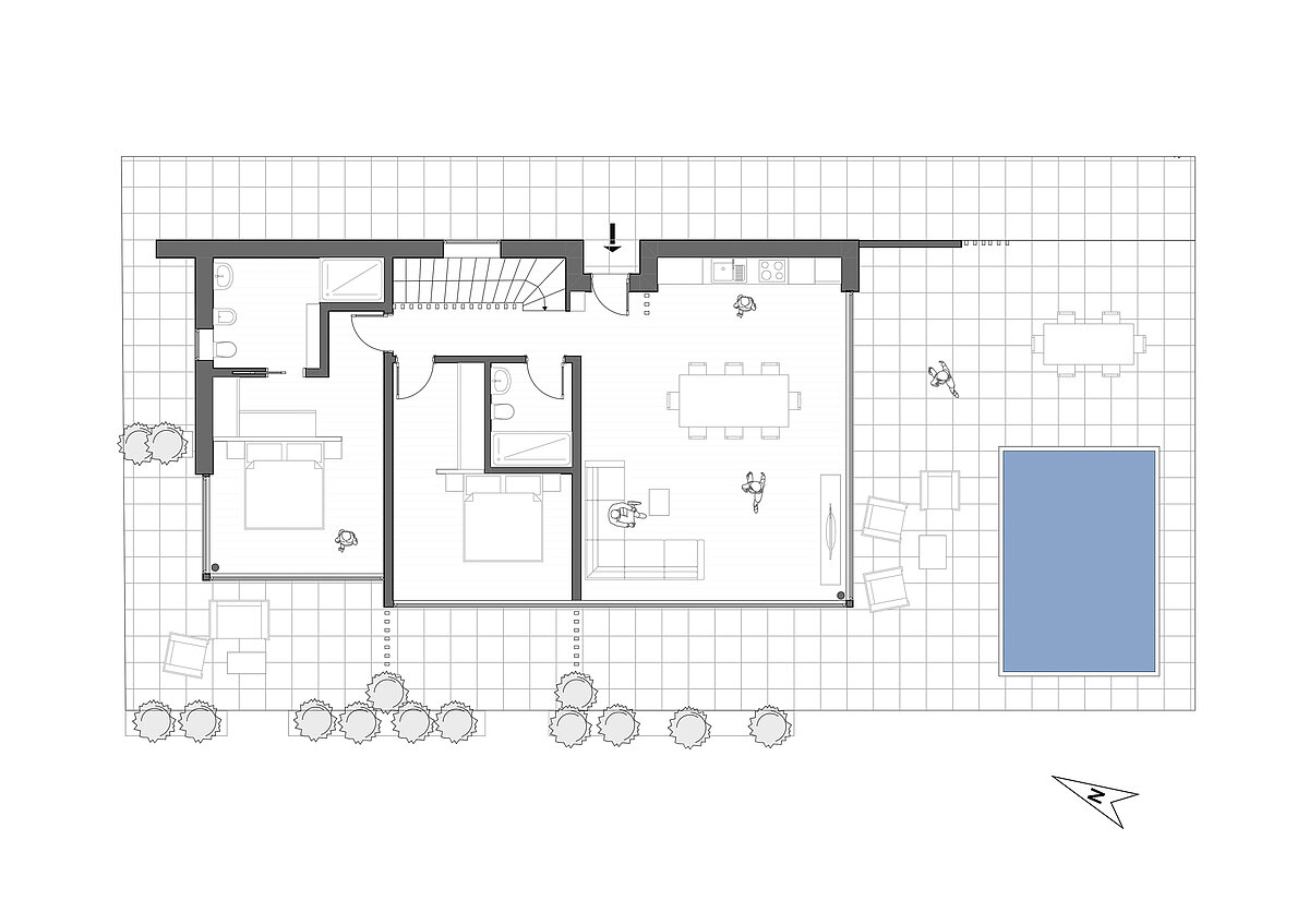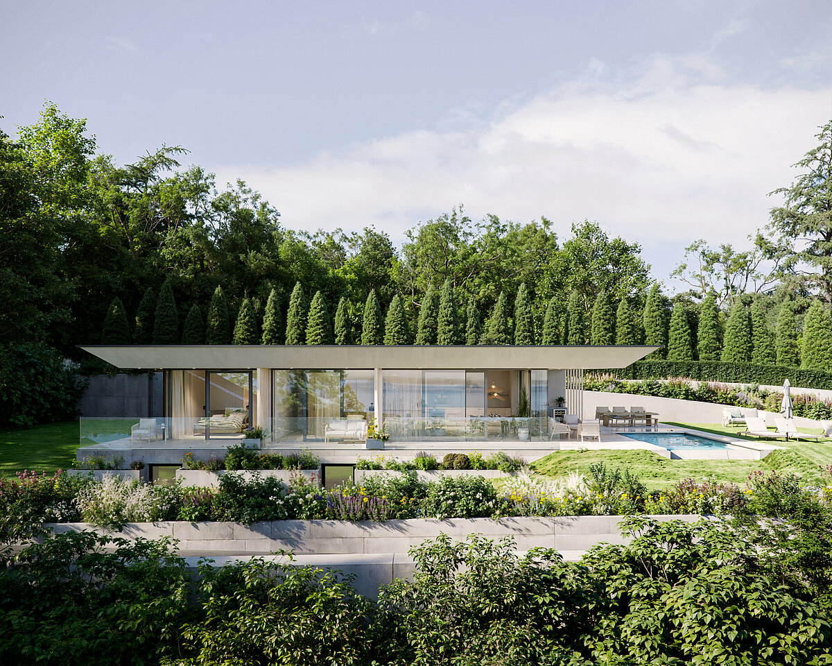 This elegant villa extends over two levels and impresses with its well-designed layout and high-end finishes. The upper level features two refined bedrooms, two modern bathrooms, and a spacious living and dining area with an open-concept designer kitchen. Expansive glass fronts create a seamless connection between indoor and outdoor spaces and provide direct access to the sunny terrace and the beautifully landscaped private garden with pool and stunning lake views.
