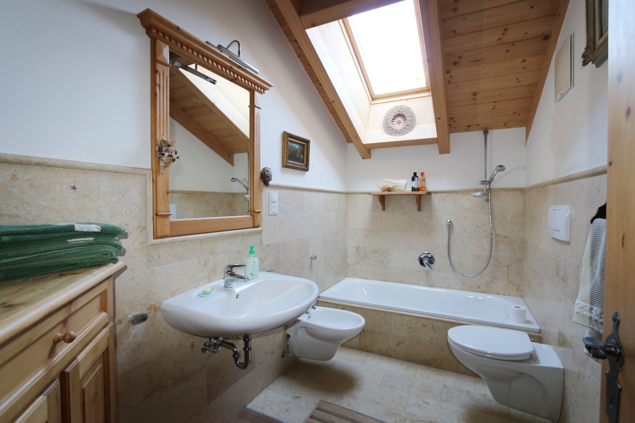 The apartment is located on the 1st floor and has an entrance area, a bathroom, a bedroom and a very large living area with kitchenette. The high-quality furnishings in Tyrolean style and especially the hand-painted tiled stove are particularly noteworthy. The residential building does not have an elevator. A parking space and a cellar are included in the price.