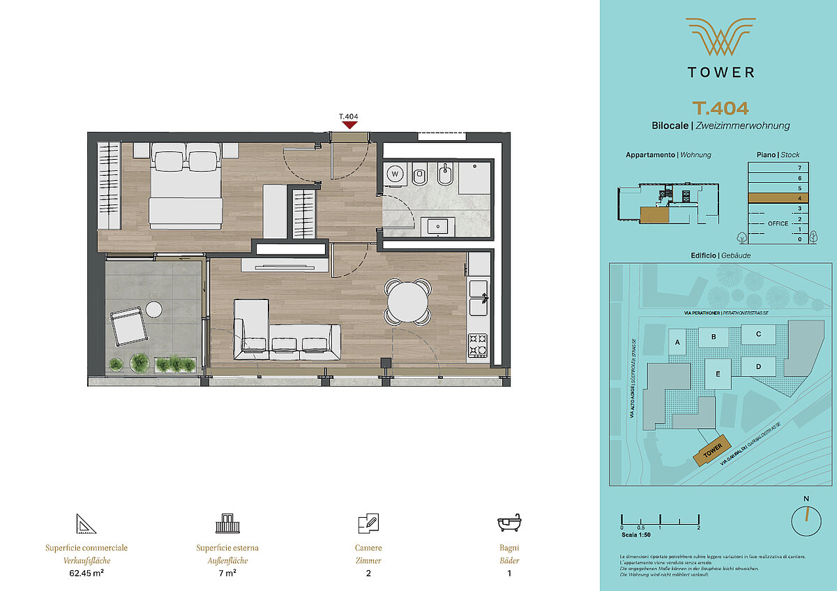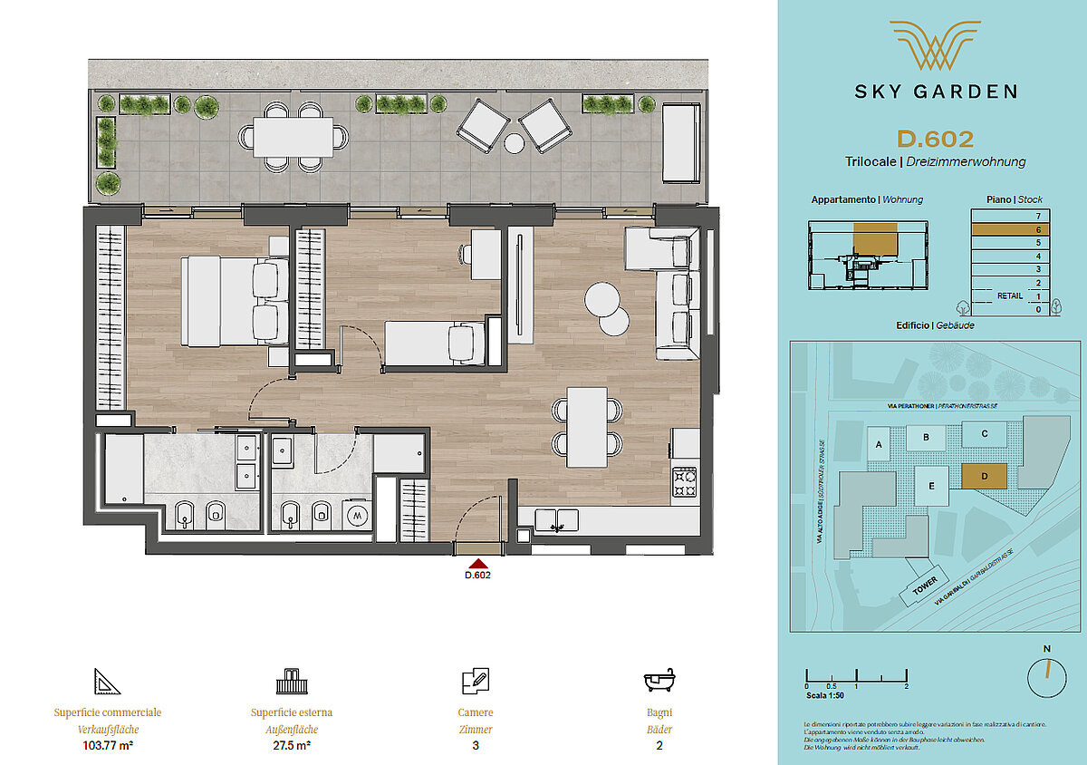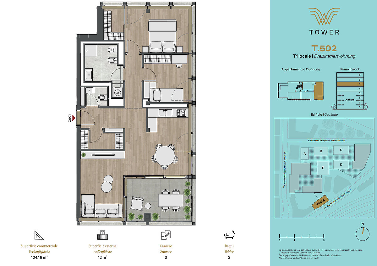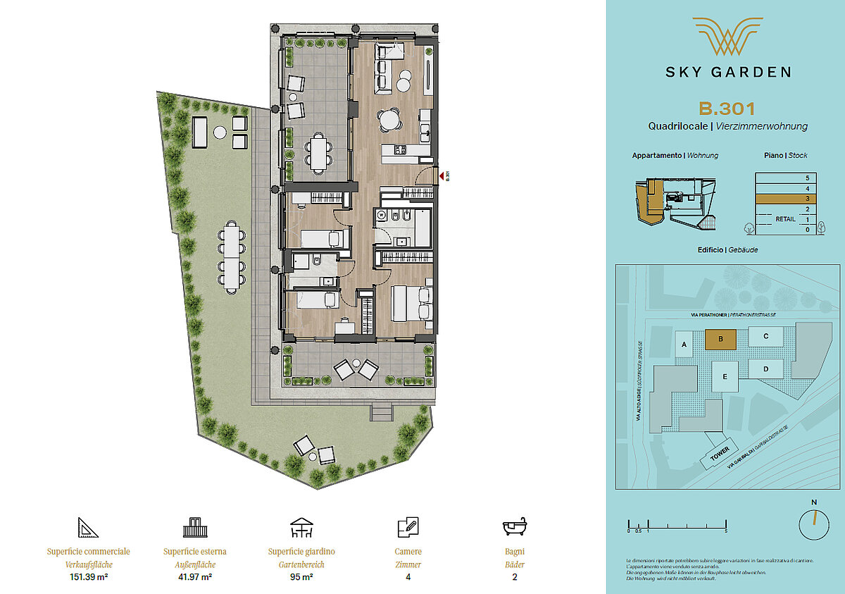 This unique real estate project is being built in the heart of Bozen between Südtirolerstrasse and Bahnhofsallee. From the third floor up to the seventh floor, city apartments with 2-3-4-5 rooms of the highest standards are being built with beautiful private gardens and/or terraces. Dream penthouse apartments with wonderful roof terraces/gardens complete the offer.