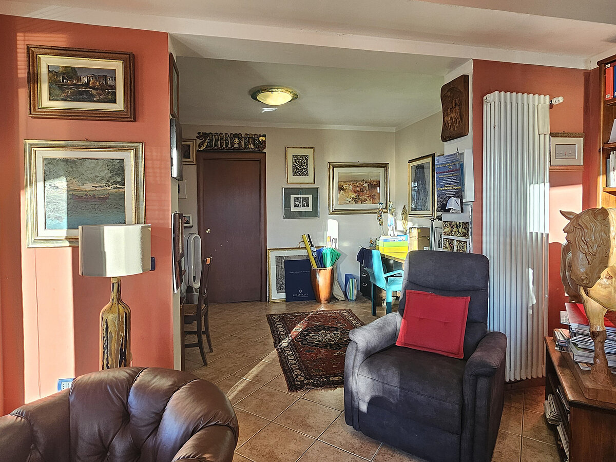 The living room is welcoming and bright, perfect for hosting or relaxing, while the eat-in kitchen offers a comfortable space for socializing. A versatile study can be used for smart working or as an additional room.