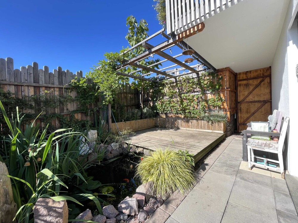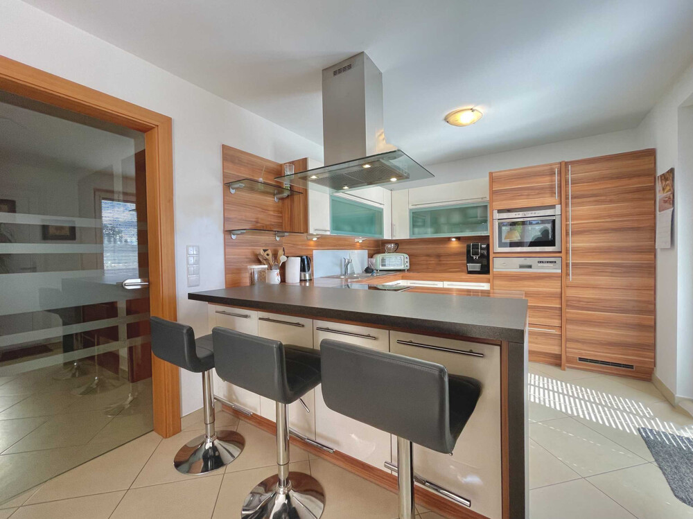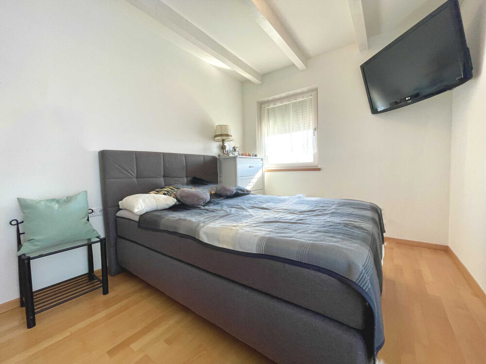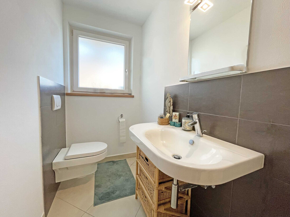 The entrance area and a bright eat-in kitchen with integrated dining area are located on the first floor. From here you have direct access to the compact, low-maintenance outdoor area that surrounds the house and is ideal for relaxing outdoors. There is also a daytime WC on the first floor. Three bedrooms await you on the first floor, each with access to two balconies with a sunny south-west orientation. The spacious bathroom is equipped with a shower, a bathtub and a modern WC with bidet function. The attic, which offers additional storage space, can be reached via a pull-out ladder.