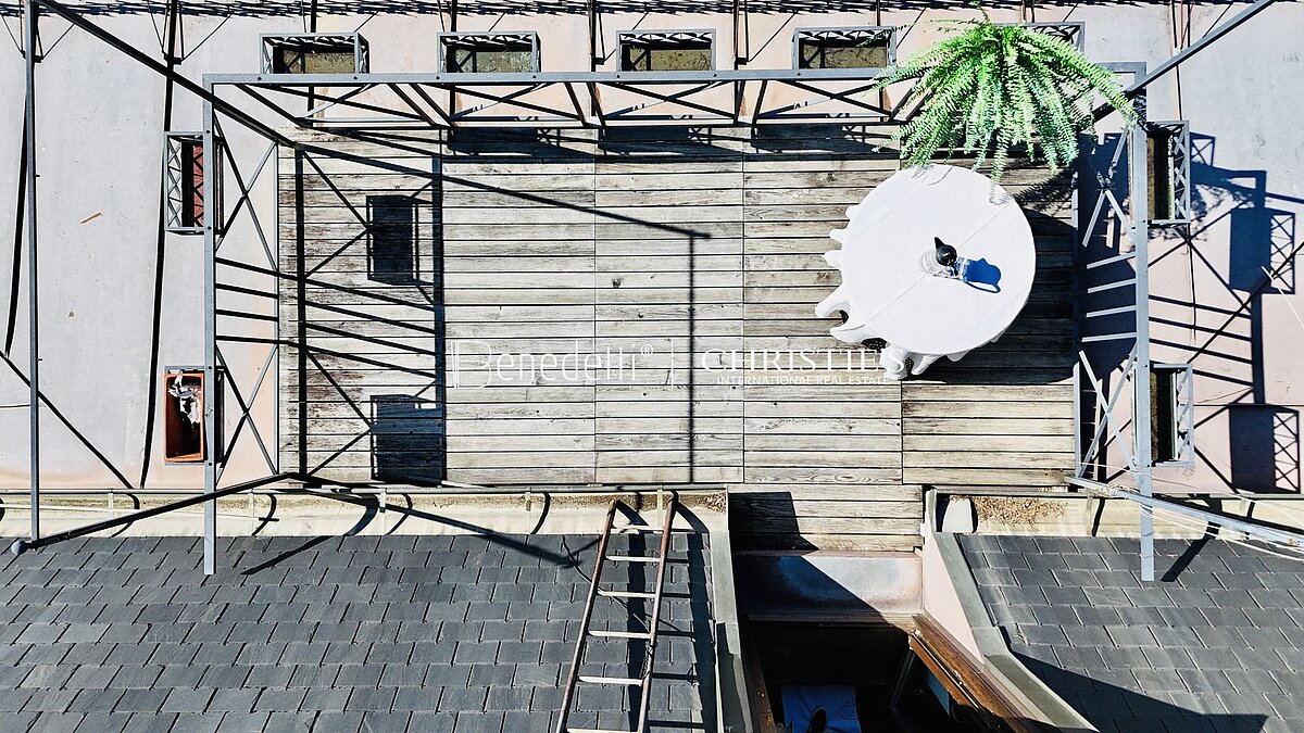 4th floor – The exclusive penthouse features a spacious open-plan area (94 m²) with high-quality solid wood flooring, beautiful exposed beams, and a functional fireplace that creates a cozy living atmosphere. From here, you can access the expansive panoramic terrace, which is the highlight of the apartment, offering breathtaking views. The kitchen area with a skylight is simple, as is the bathroom with a bathtub, leaving plenty of room for customization.