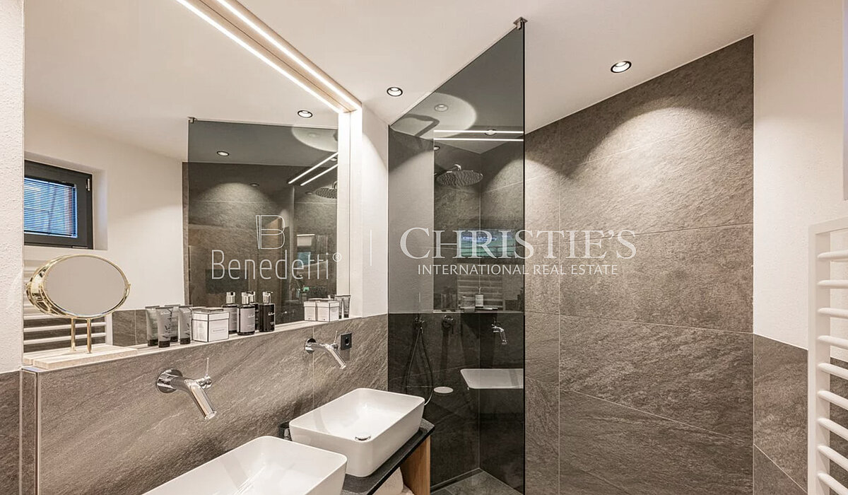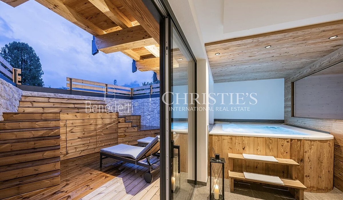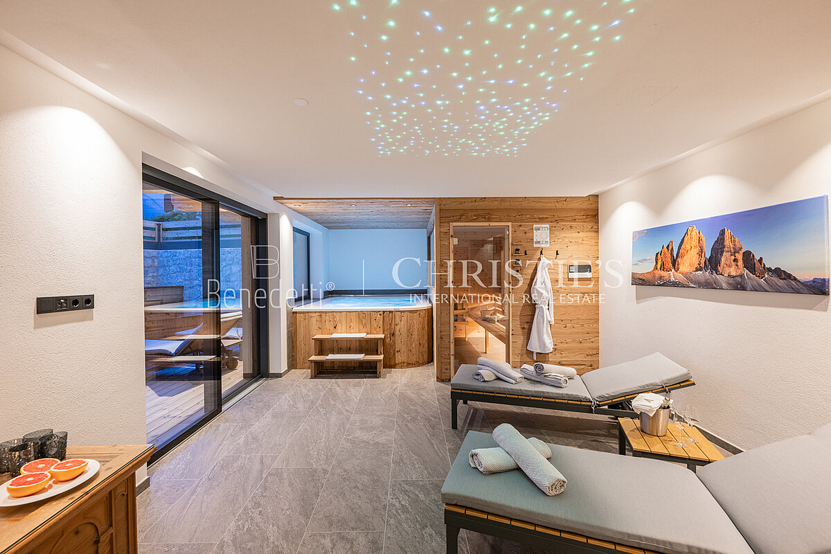 On the ground floor there is a refined private wellness area, ideal for relaxing after a day spent outdoors. The spa features a whirlpool bath, sauna and a comfortable relaxation area, as well as a dedicated bathroom serving the wellness area. From this level there is also access to a small outdoor terrace, perfect for breathing in the fresh air of the Dolomites and enjoying the tranquillity of the alpine landscape.