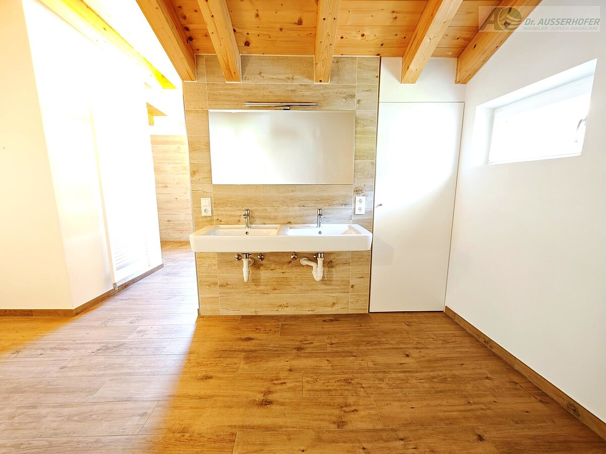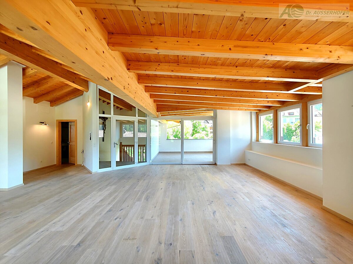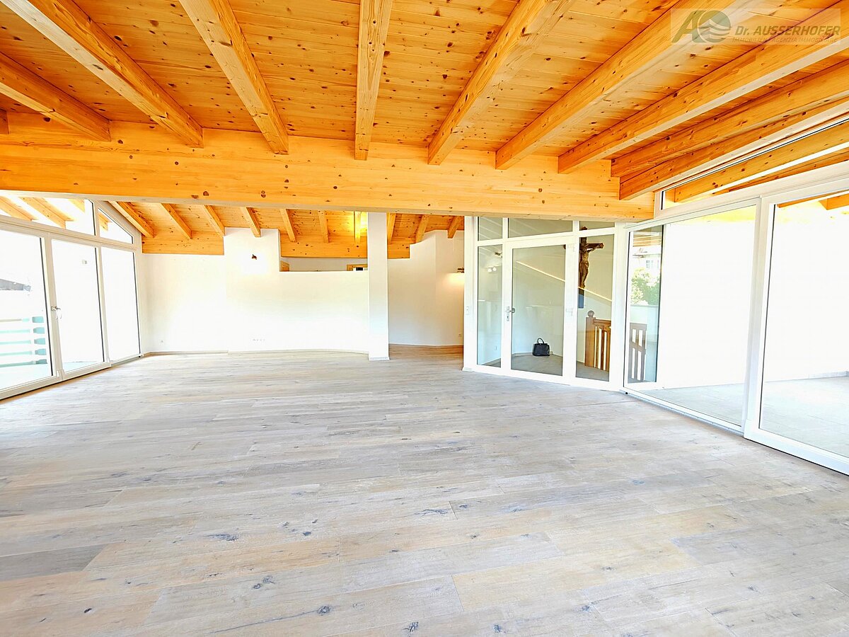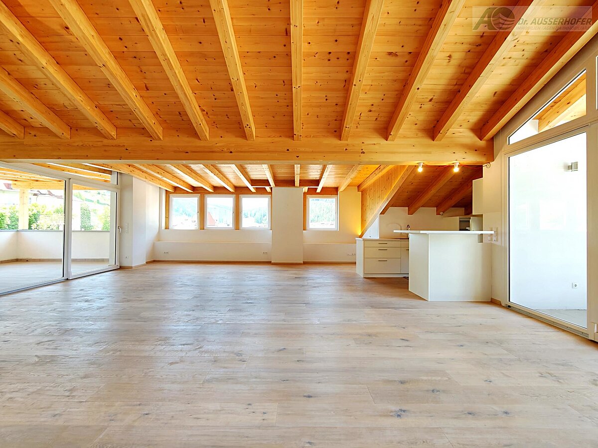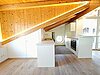 The roughly 75 m² open-plan living area stylishly connects living, dining, and cooking. A custom-built kitchen and elegant wooden floors give the space a warm and inviting atmosphere. Large window fronts provide abundant daylight throughout the day and offer access to the southeast-facing terrace as well as the west-facing loggia—perfect for enjoying the sun from morning until evening.