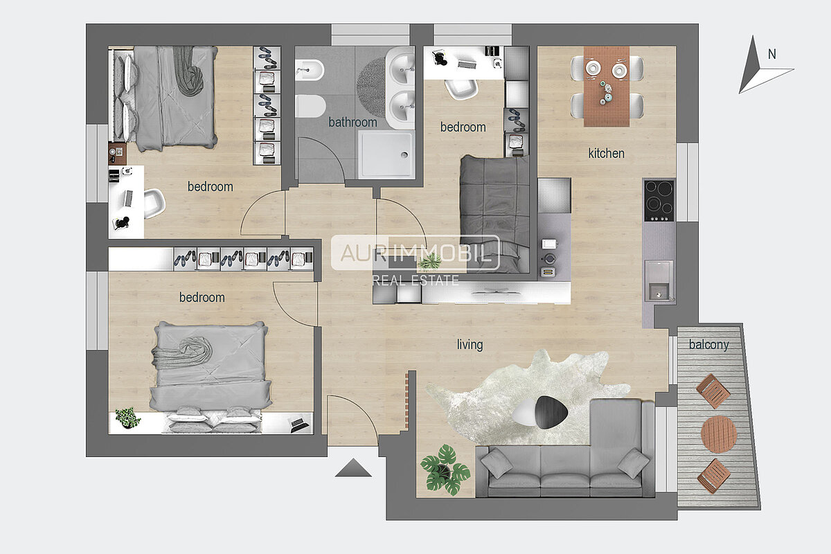 The four-room apartment is situated on the second floor of a small residential building and offers approx. 74 m² of well-designed living space. It features an entrance area with wardrobe, a bright living room with kitchenette, a balcony, two double bedrooms, one single bedroom, and a spacious bathroom with a window.