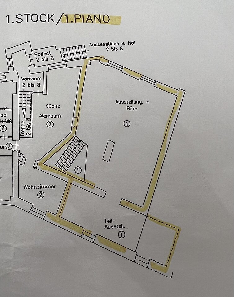 Die großzügige Fläche von 530 Quadratmetern verteilt sich zwischen Erdgeschoss und 1. Stock. Ideal als Geschäft, Büroräume oder/und Austellungsräume.