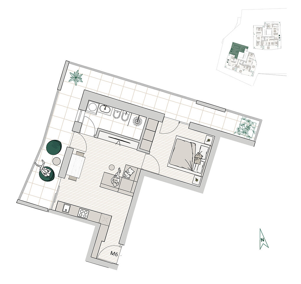 The apartment is located on the second floor (House M) and consists of a kitchen and dining area, a bedroom, a bathroom, a terrace and a cellar. A garage box can also be purchased.
