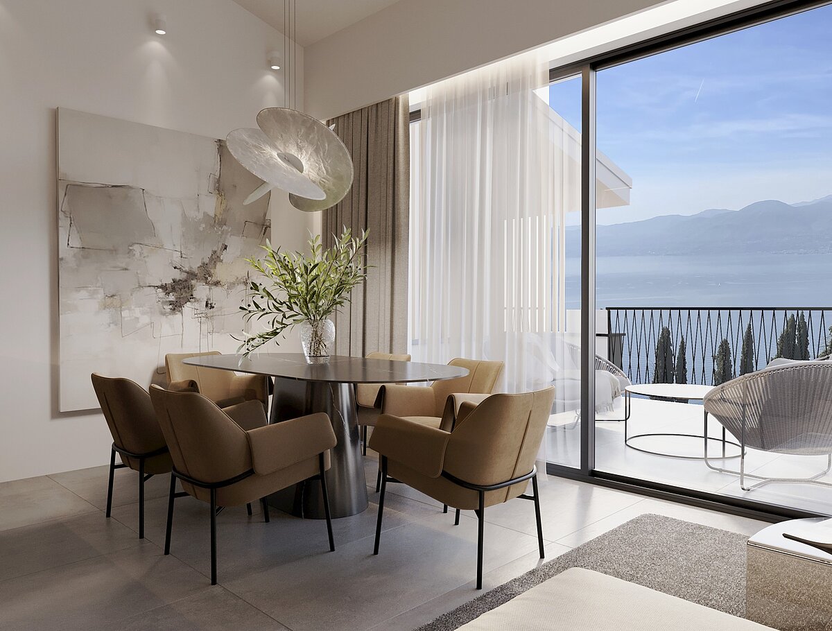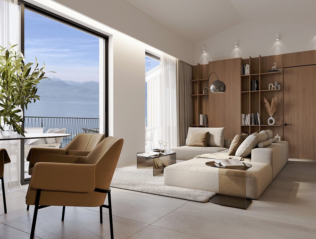 Both the tastefully furnished bedroom and the living area offer direct access to the spectacular panoramic terrace - the perfect spot for convivial moments with an unrivaled view of Lake Garda.