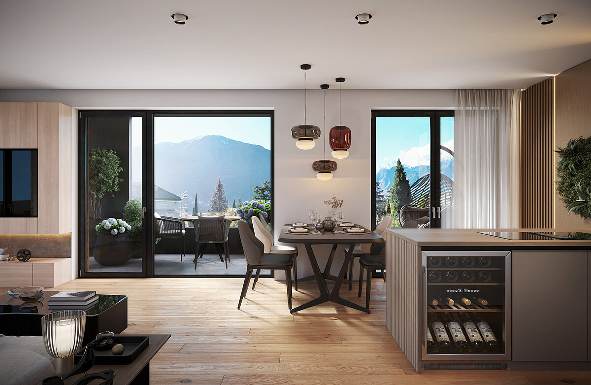 This modern apartment is located on the ground floor of a newly constructed residential building in Merano and is characterised by a clear internal layout and bright living spaces. The open plan living area with kitchen connects to the private terrace and opens onto the garden, creating a pleasant outdoor extension of the living space. Two bedrooms allow flexible use, while two bathrooms provide additional comfort. A private basement room offers practical storage and completes the overall picture. Garage parking spaces within the complex are available at an additional cost.