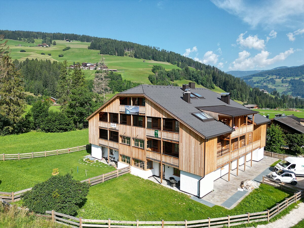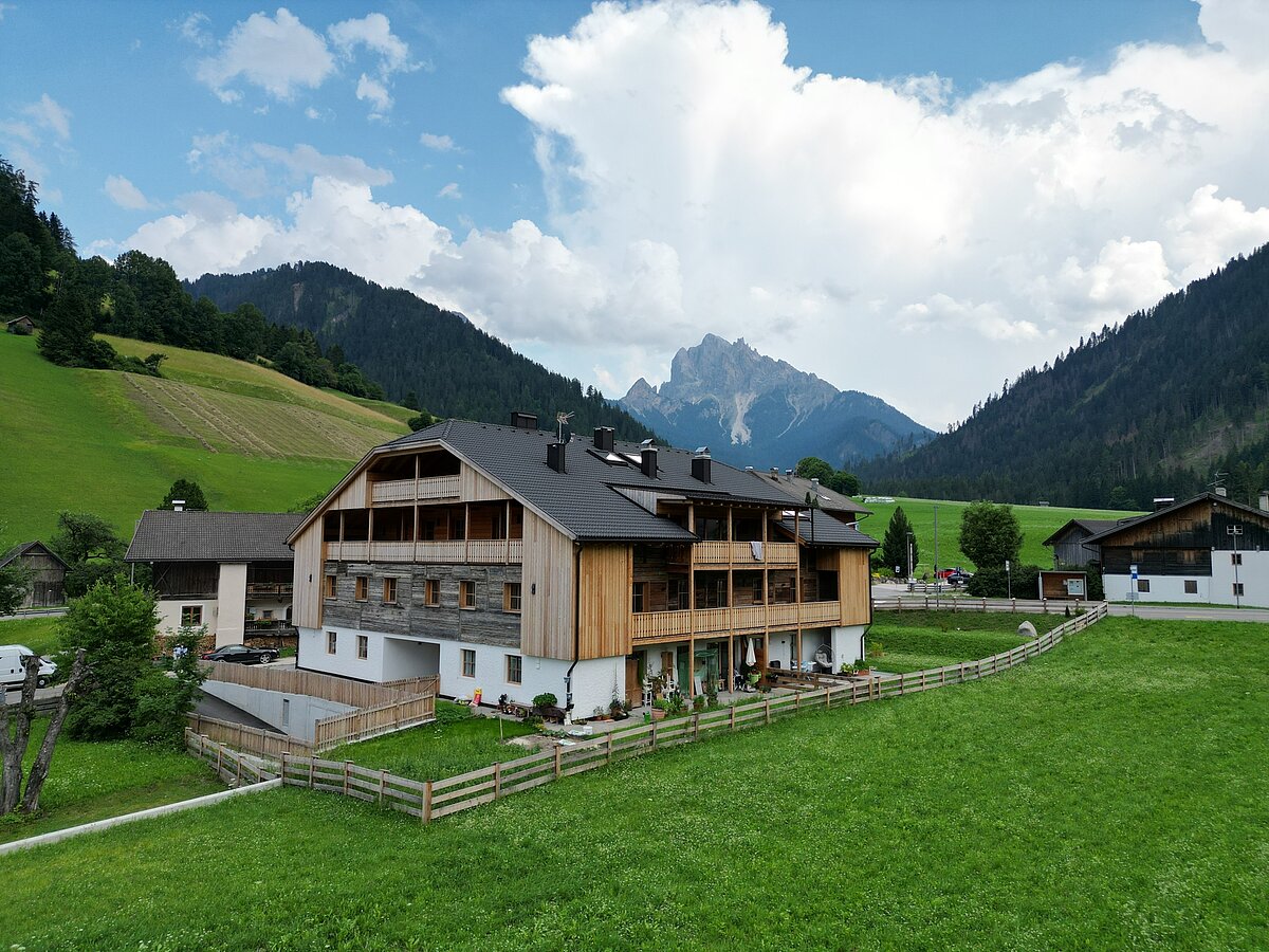 In this project, a traditional farmhouse in a sunny location in Braies was demolished and rebuilt with a modern interpretation. The house is now divided into 12 residential units. The facade is made of old wood from the former farm.