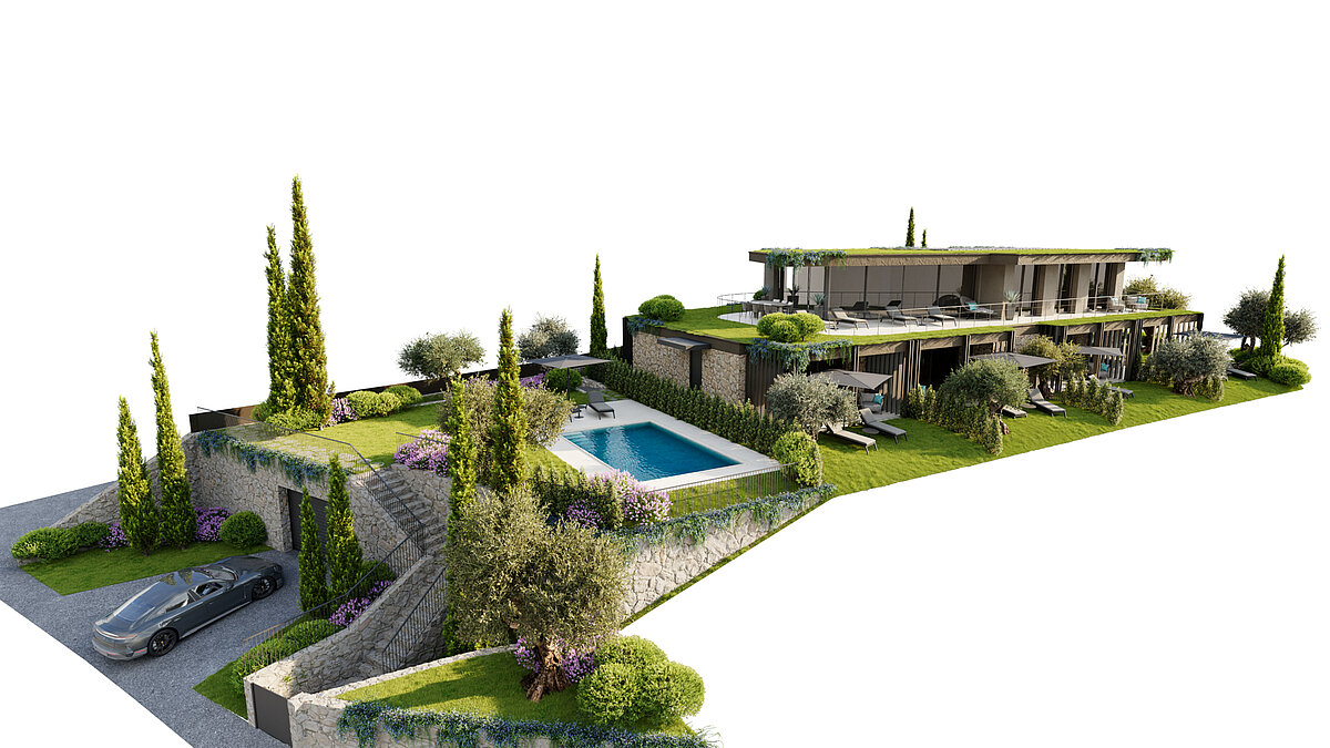 A particular highlight of the residence is the elegant swimming pool area with generous sunbathing spaces, refined natural stone finishes and beautifully maintained green areas.