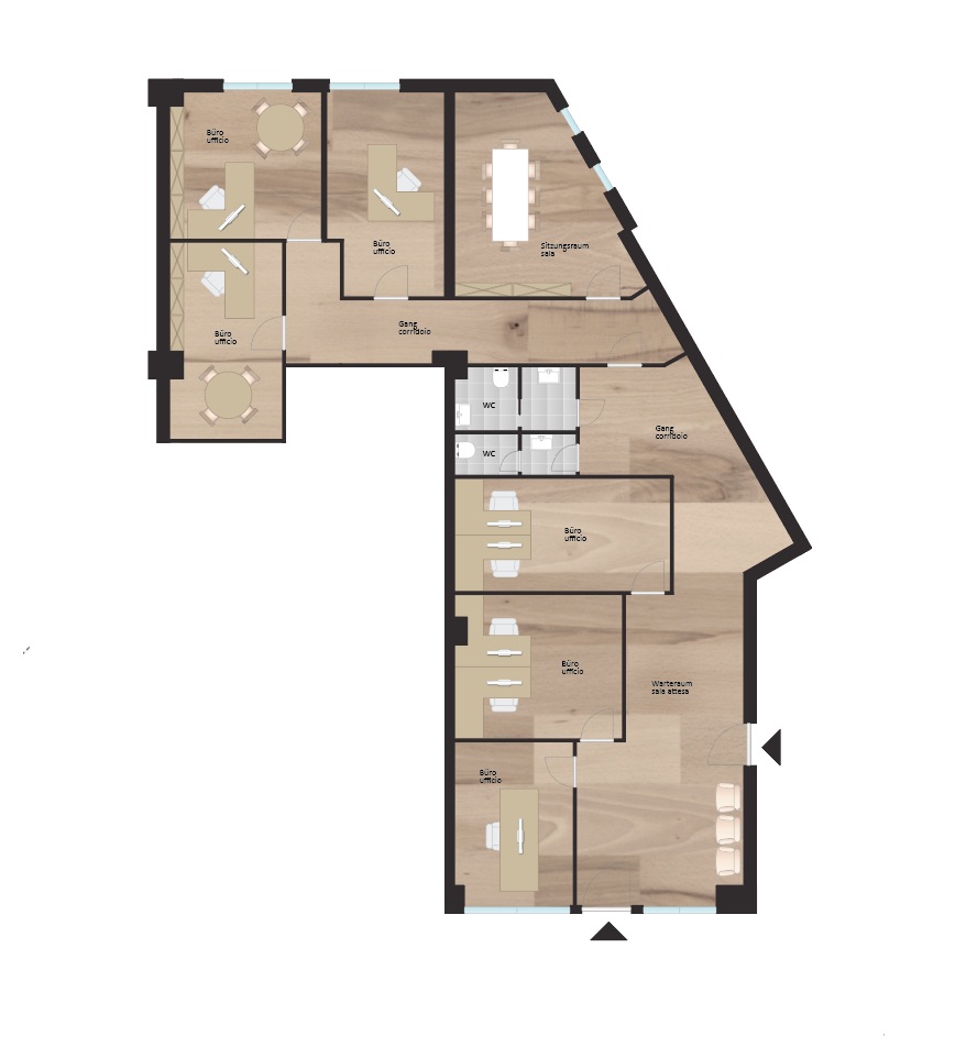 This is a beautiful office space, divided into a spacious reception/waiting area, six offices offering space for 2–3 people each, a meeting room, an archive, and two restrooms.