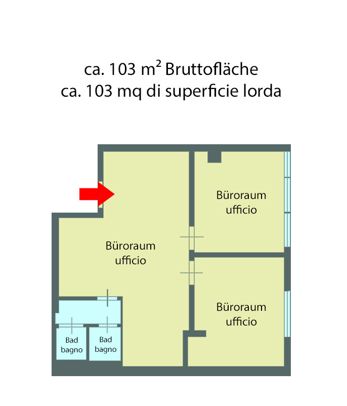 An office space is for sale on Giuseppe-Vittorio-Strasse in Bolzano, located in the easily accessible and highly developed commercial zone. The property offers a total area of 103 m² and is characterized by a flexible room layout. The large office space is currently divided into three smaller units by plaster walls, which makes it easy to adapt to individual requirements. The office also has two WC units with an anteroom. A parking space in the underground garage can be purchased separately on request at a price of 25,000 euros.