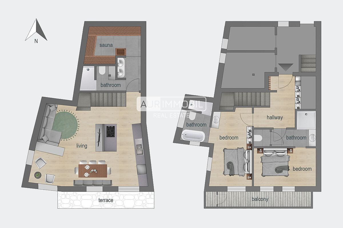 The two-story apartment consists of an entrance, two bedrooms, two bathrooms, and a balcony on the first floor. A staircase leads to the ground floor, where you'll find a living area with kitchen, a bathroom with sauna, and a terrace with a private garden.