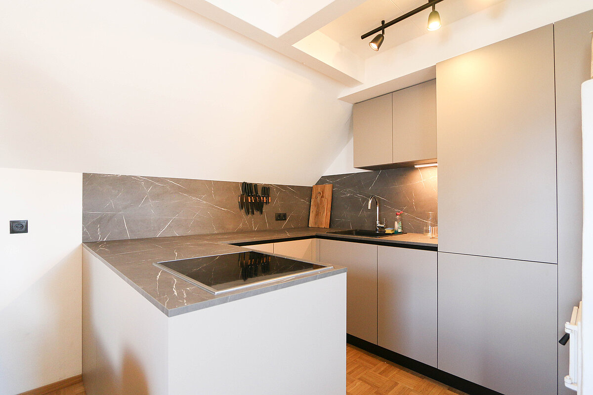 The open-plan living area impresses with its modern and spacious layout and a stylish fitted kitchen that blends harmoniously into the elegant overall design. Premium finishes, carefully planned lighting, and custom-made furnishings create a distinctive and refined living atmosphere.