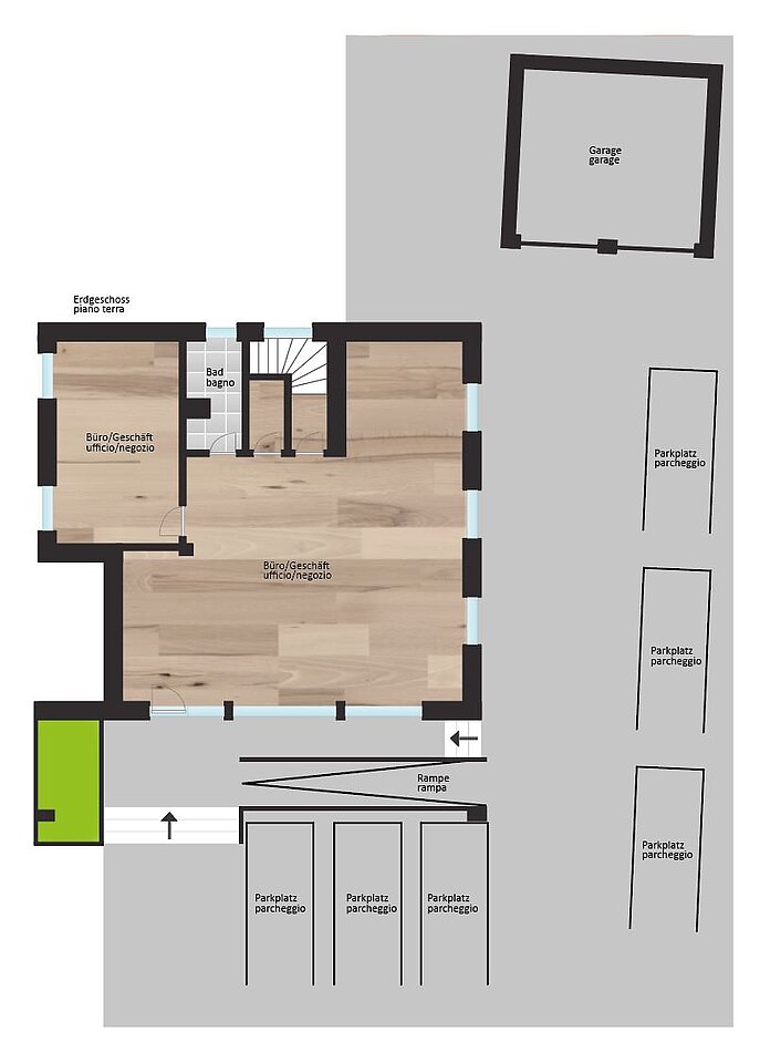 The business premises with four parking spaces are centrally located in Brunico, not far from the new NOI Technology Park, the municipality of Brunico and the post office.