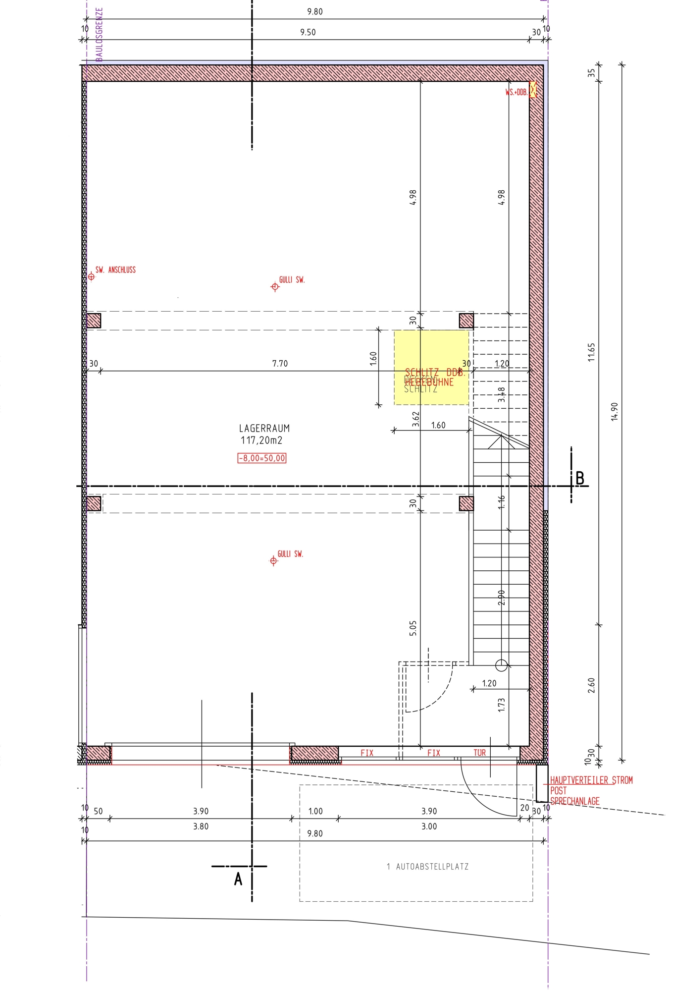 On the ground floor there is a slot for a lifting platform; on the first floor there are bathrooms and an area for offices, whereby the interior layout can be adapted to the respective needs.