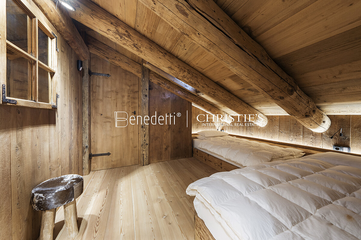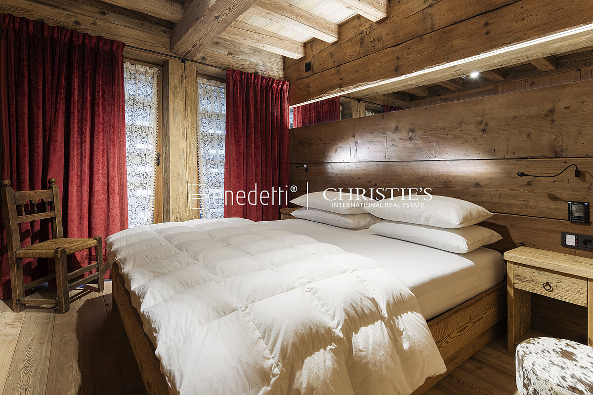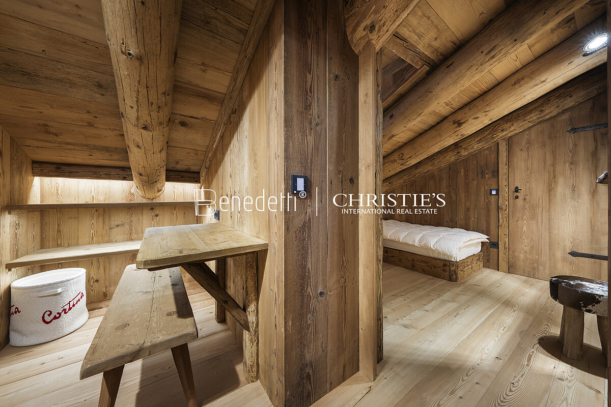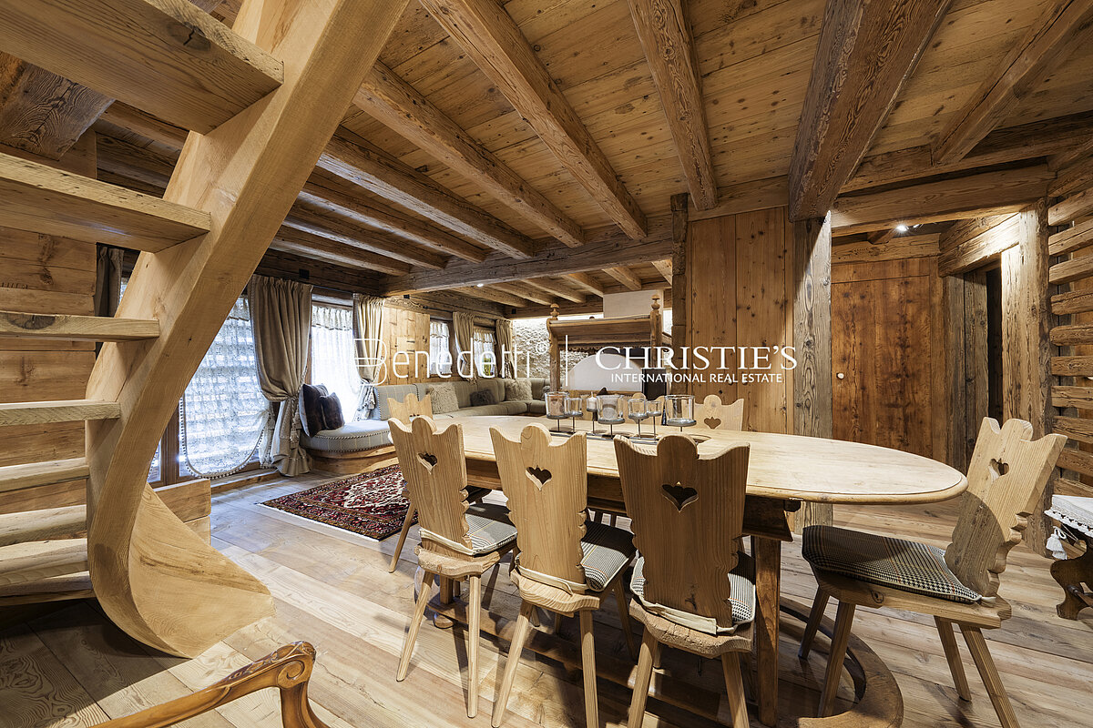 Not far from Corso Italia, the shopping street and beating heart of Cortina's social life, the property boasts an area of 170 square meters and stands on two floors of a characteristic mountain chalet.