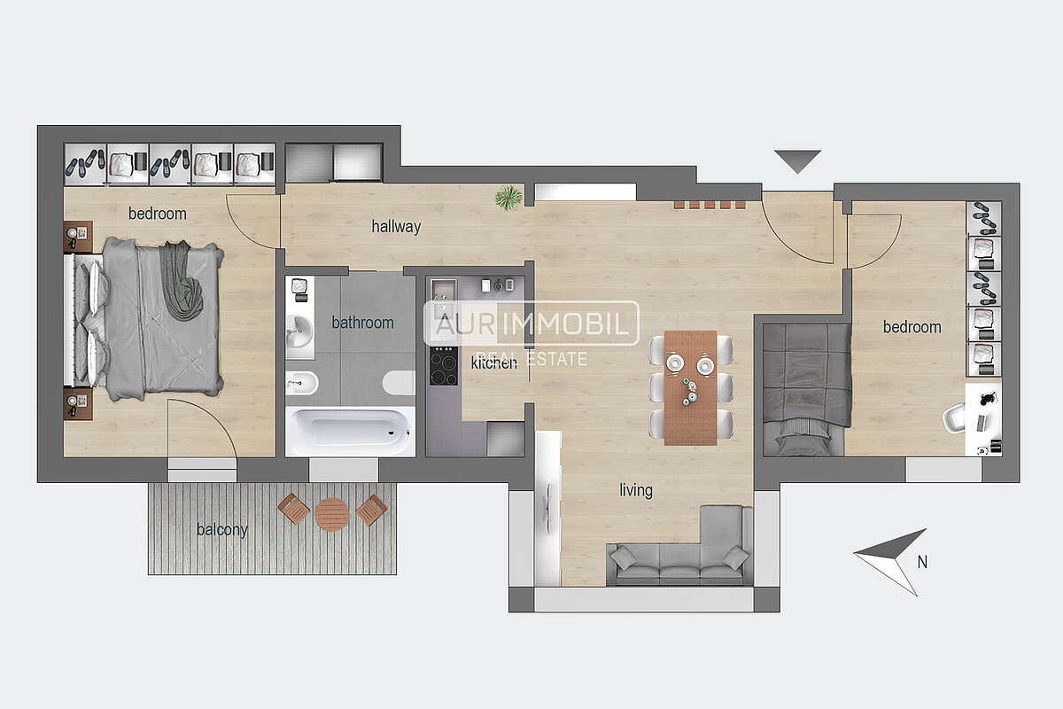 The three-room apartment on the second floor consists of a living room with kitchenette, one bathroom, one hallway, two bedrooms, and one balcony.