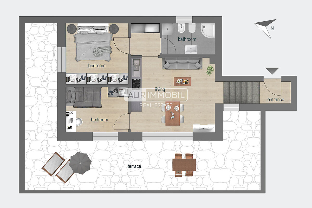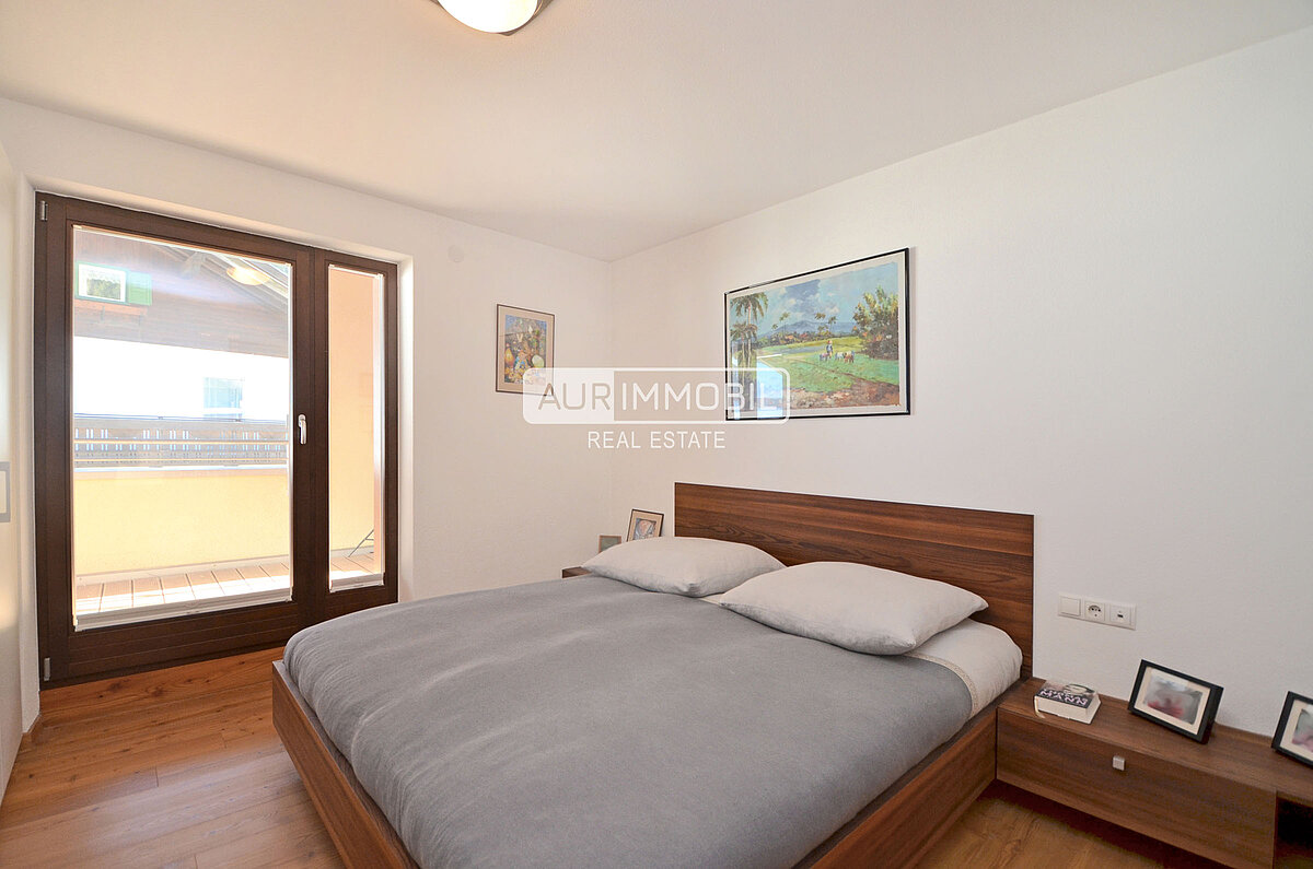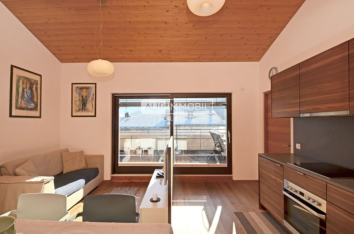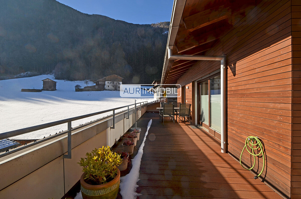 Located in a pleasant area of Luttach and just a few minutes walk from the town center, this tastefully furnished three-room apartment is situated on the top floor and consists of: an entrance hall with wardrobe, a cozy and modern open-plan living kitchen, two bedrooms, a bathroom with window, and a large wrap-around terrace. The terrace is accessible not only from the living kitchen but also directly from both bedrooms.