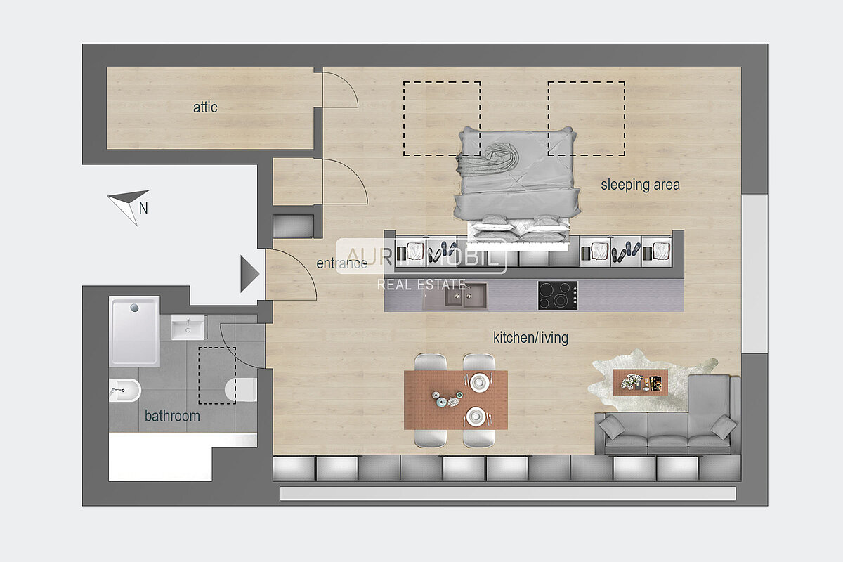 The two-room apartment – 52 m² gross floor area (approx. 39 m² living space) – features a bright living area with kitchenette and wonderful panoramic views of Plan de Corones, a sleeping area, and a bathroom with shower.