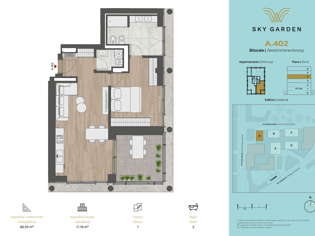 APPARTAMENTO A402 - Syk Garden A: Proponiamo in vendita nuovo, ampio bilocale con loggia al quarto piano - disposizione interna quanto segue: ingresso, soggiorno con cucina, stanza da letto con bagno padronale, bagno di servizio e loggia.