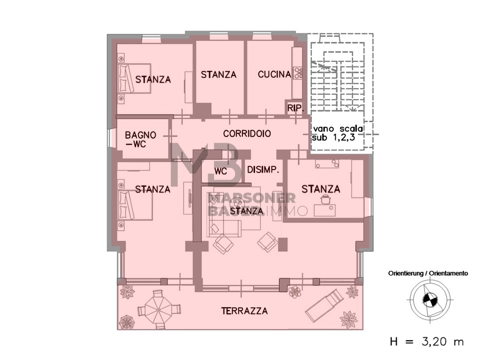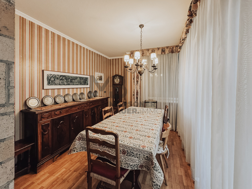 Piano rialzato: atrio/disimpegno spazioso, guardaroba, cucina abitabile, 4 camere da letto rispettivamente studio o ufficio, soggiorno sul lato sud con accesso al terrazzo di ca. 30 m² esposto a sud, W.C. di servizio e bagno finestrato con W.C.;