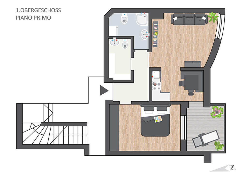 Il luminoso soggiorno si apre sulla soleggiata loggia a sud. La cucina abitabile offre spazio sufficiente per cucinare e trascorrere del tempo. Il piano comprende inoltre una comoda camera da letto, un bagno, un WC di servizio e un accogliente ingresso.