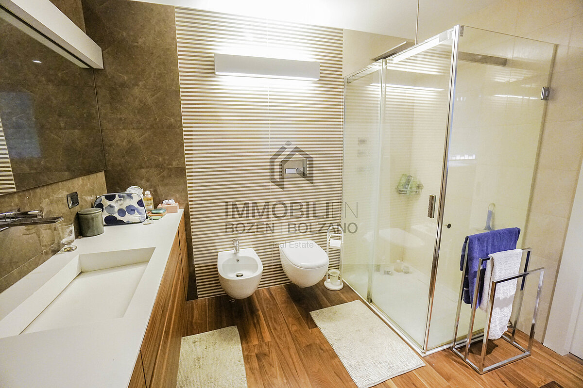 Questo straordinario appartamento al piano terra, con una superficie di circa 160 m², colpisce per il suo elegante concept abitativo e le finiture di alta qualità. L’ampia e luminosa zona giorno con cucina a vista di design, affiancata da una seconda cucina discretamente integrata, offre il massimo comfort abitativo. L’appartamento dispone di una camera da letto, due bagni raffinati ed è arredato con gusto (letto escluso). Completano la proprietà un giardino privato, una piscina condominiale e una piccola area fitness ad uso comune. Un’ampia cantina e un garage doppio sono inclusi nel canone di locazione.