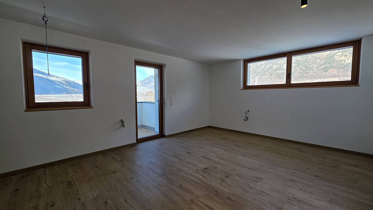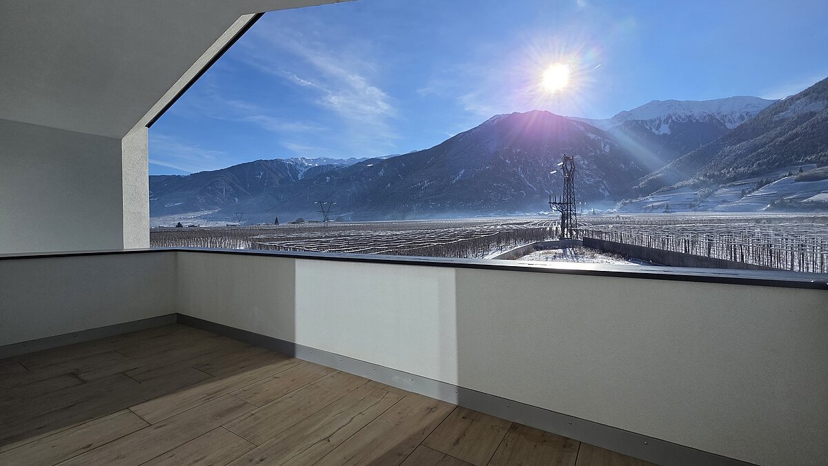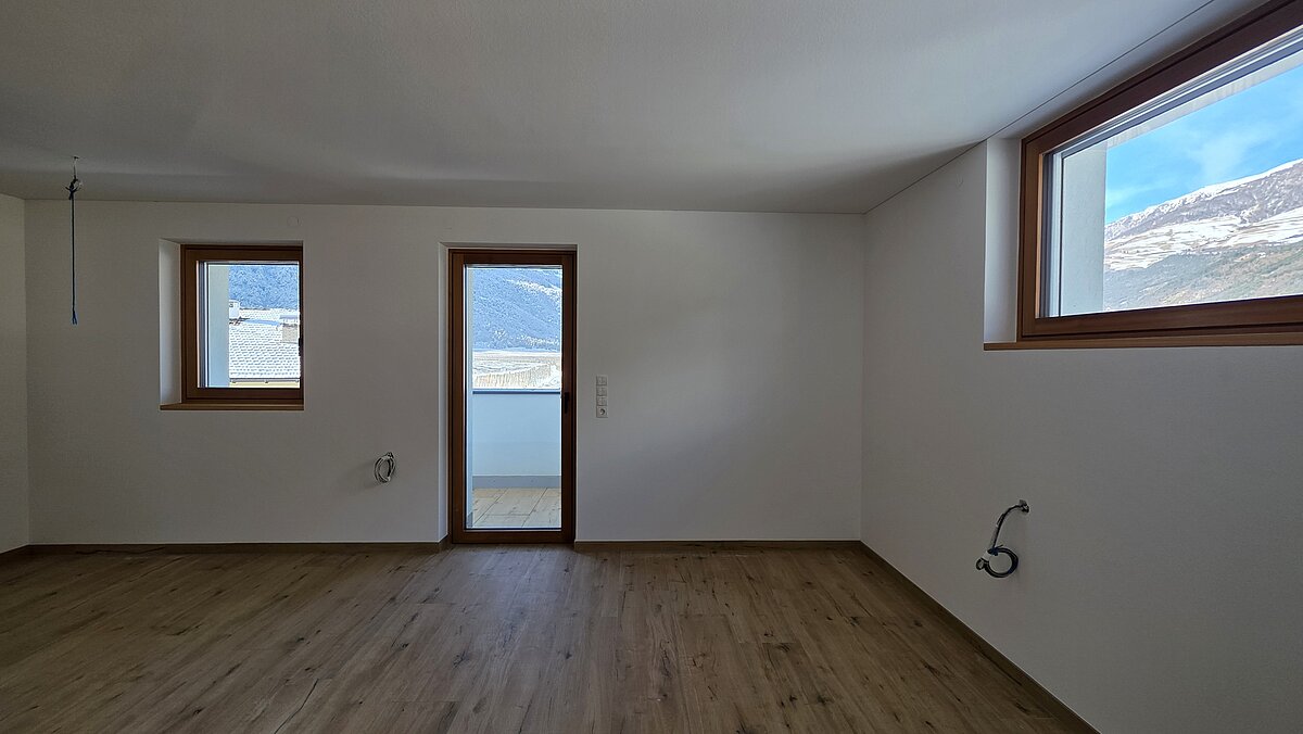 L’ampia zona giorno rappresenta il cuore dell’abitazione. Le grandi superfici vetrate aprono lo spazio verso la terrazza soleggiata, creando una continuità armoniosa tra interno ed esterno. L’esposizione a sud garantisce ambienti luminosi per tutto il giorno e una sensazione abitativa di assoluto benessere.