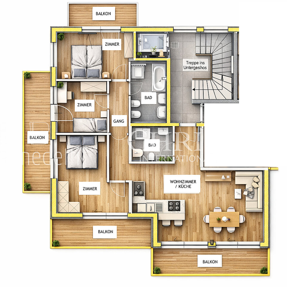 Lo spazioso quadrilocale convince per la disposizione degli ambienti ben studiata e l'abbondanza di luce. Il cuore dell’appartamento è un luminoso soggiorno con angolo cottura, che offre molto spazio per cucinare, mangiare e rilassarsi. Lo spazio è completato da tre comode camere da letto e due moderni bagni, che creano un'atmosfera abitativa particolarmente piacevole.