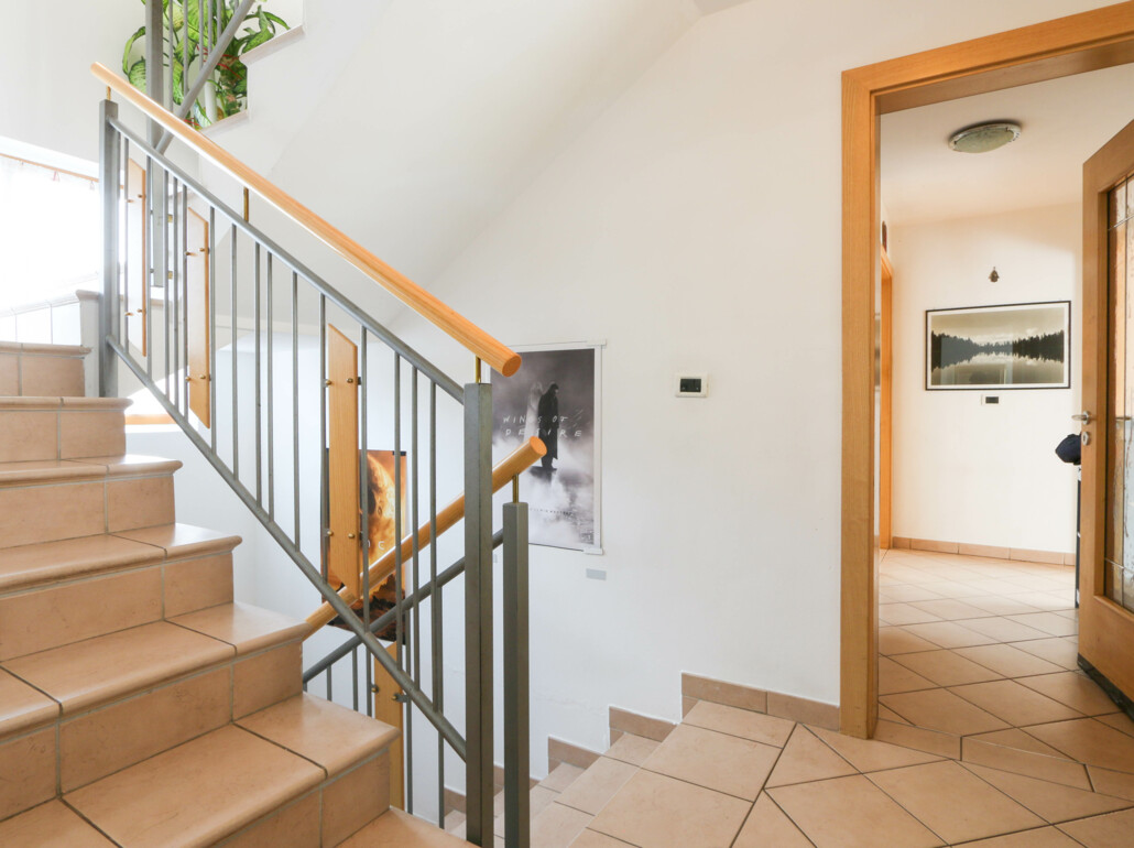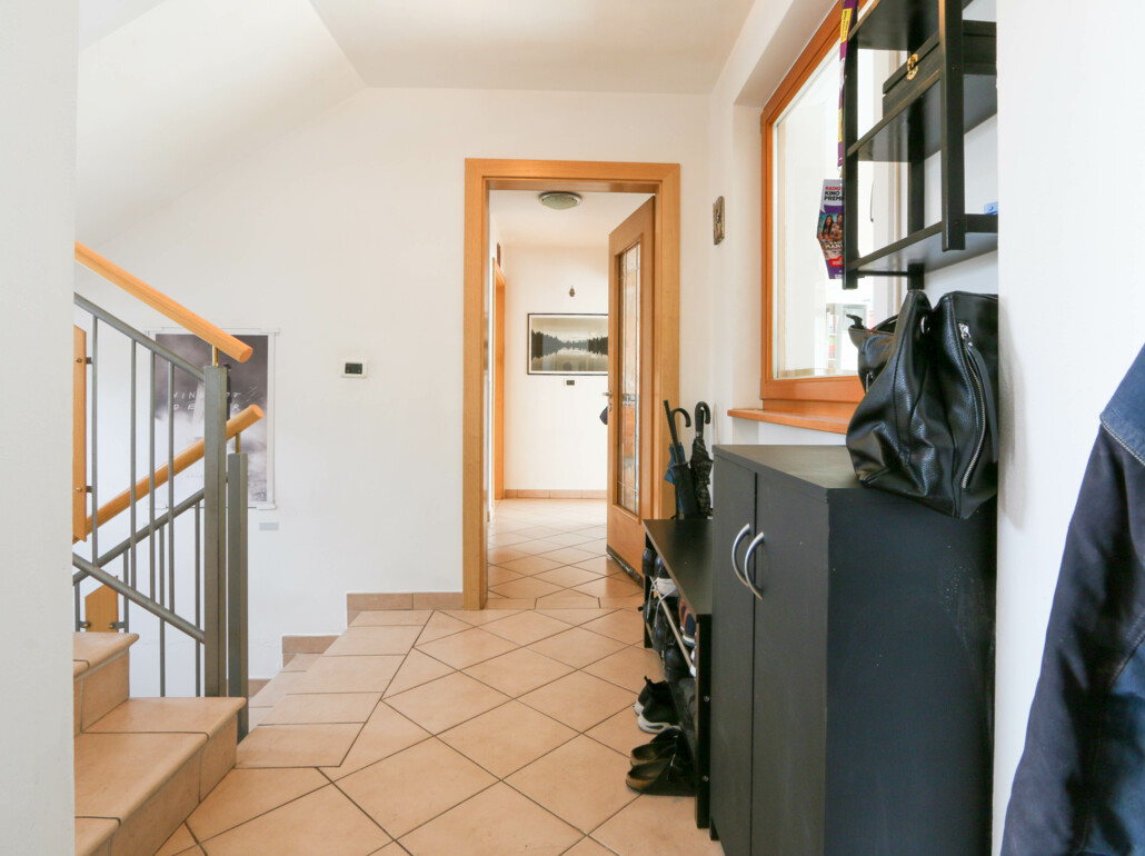 Al piano terra si viene accolti da un ingresso spazioso e accogliente. Su questo livello si trovano inoltre un bagno, una cucina separata e un ampio soggiorno con accesso diretto alla terrazza e al giardino soleggiato, ideale per momenti di relax all’aria aperta.