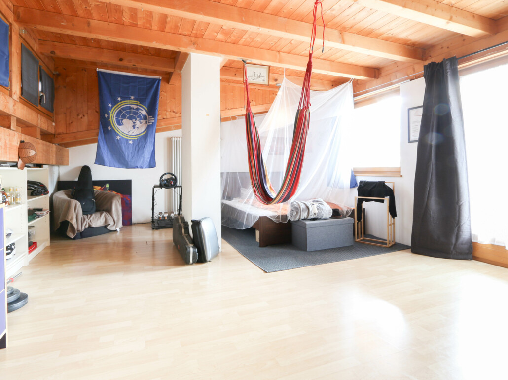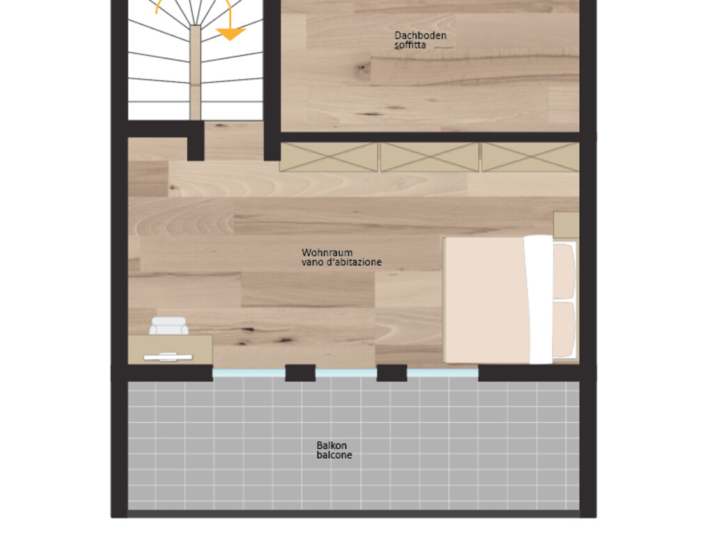 Al secondo piano è presente un ulteriore grande ambiente con balcone, utilizzabile in modo flessibile come zona giorno aggiuntiva, camera da letto, studio o spazio hobby.