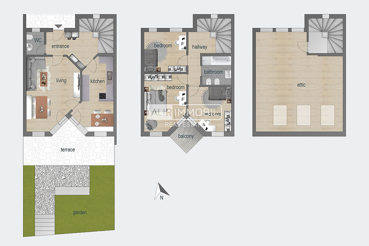 Al piano superiore si trovano tre camere da letto, un bagno e un balcone soleggiato, ideale per godersi la tranquillità e il panorama.