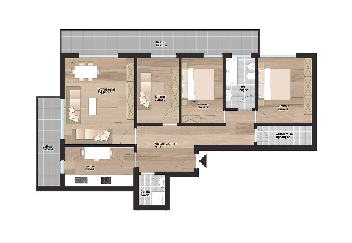 L'appartamento è composto da un ingresso, un soggiorno accogliente, una cucina, tre camere da letto, un ripostiglio, due balconi e due bagni.