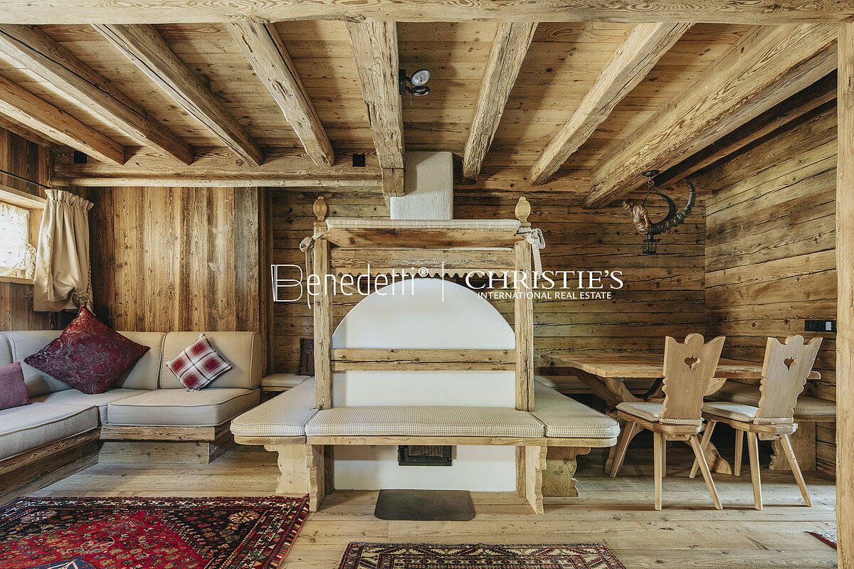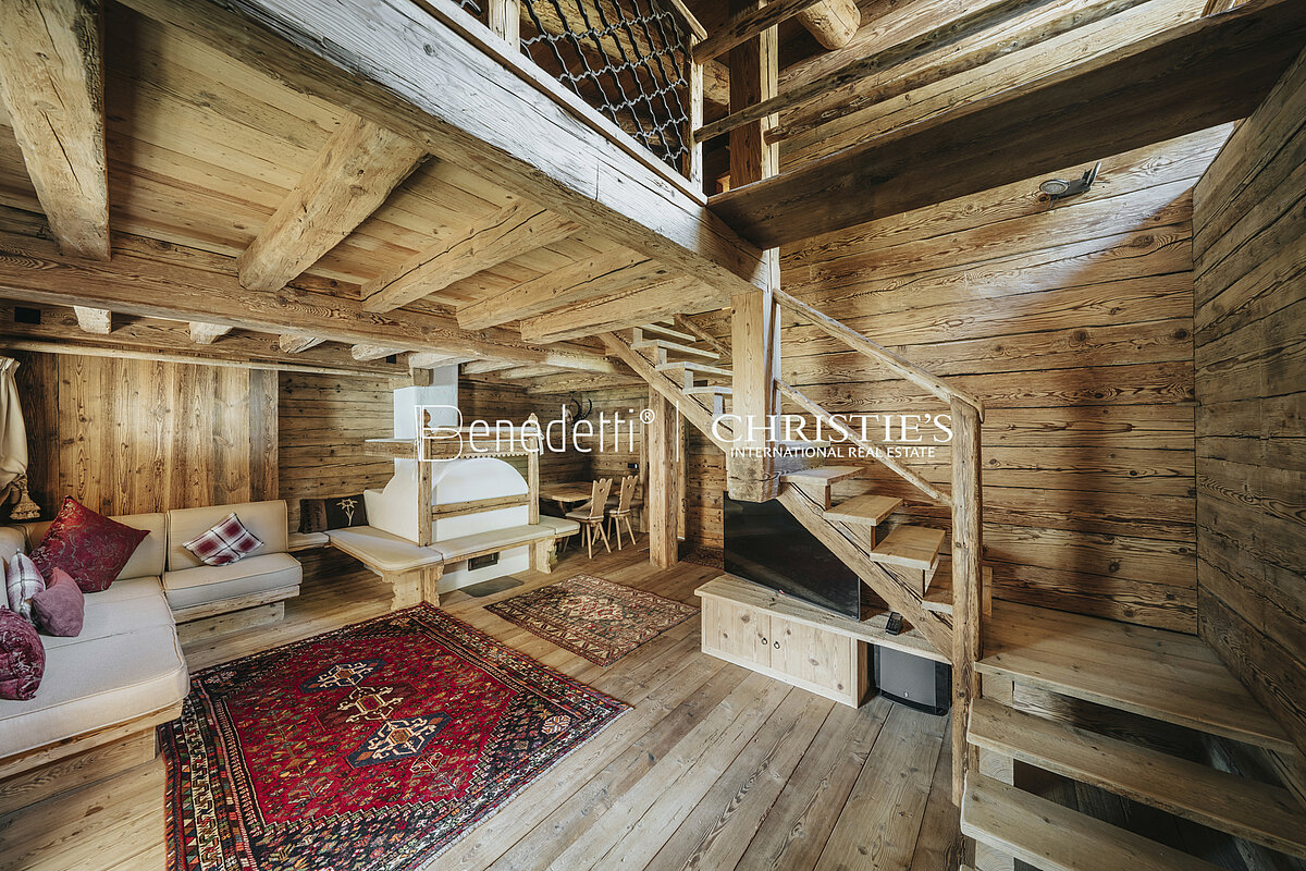 All'interno di una tipica residenza in stile ampezzano, nella panoramica frazione di Alverà a Cortina d'Ampezzo, è in vendita questo splendido appartamento di lusso, arredato in caratteristico stile alpino, completo di garage.