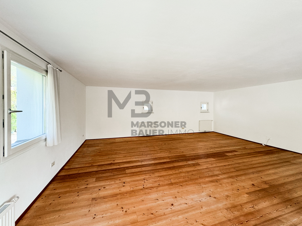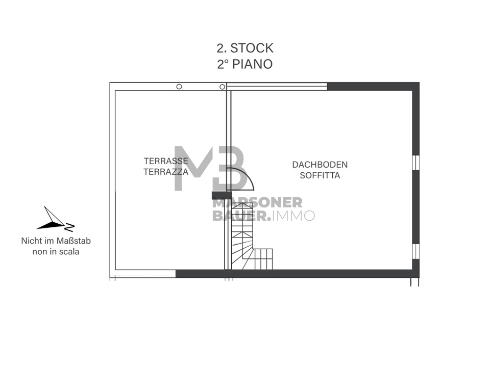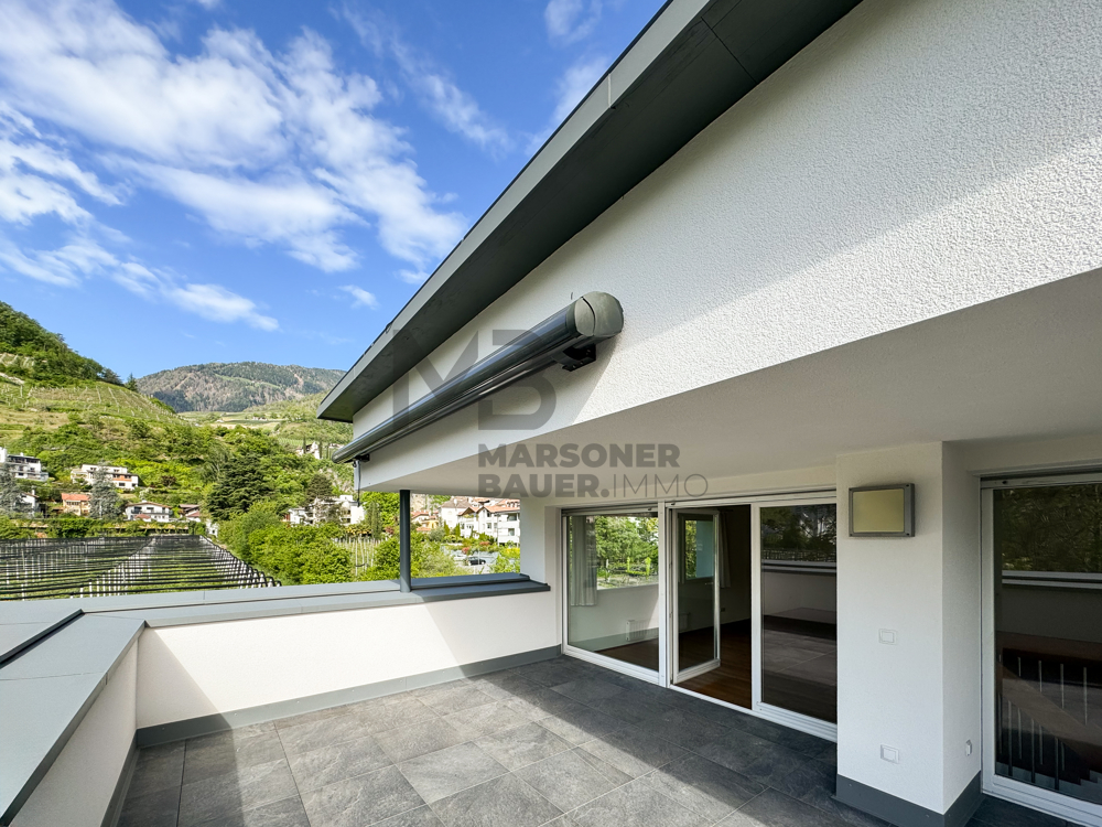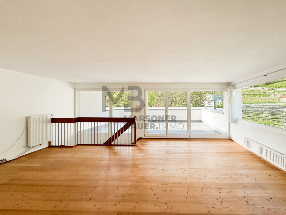 Piano sottotetto: un vano luminoso open space di ca. 44,60 mq con ampie vetrate e accesso alla terrazza sud di circa 29 mq, parzialmente coperta e con vista sui frutteti e montagen circostanti;