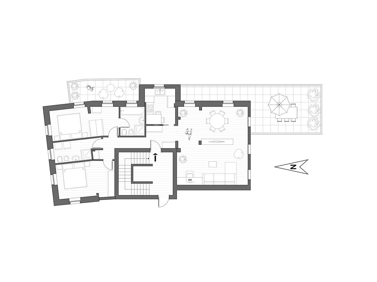 L’edificio è stato completamente ristrutturato nel 2003, dotato di impianti moderni e finiture di alta qualità, mantenendo intatto il suo carattere storico. L’appartamento offre una pianta spaziosa con soggiorno luminoso, cucina separata, due ampie camere, due bagni con finestra, corridoio, balcone e una splendida terrazza panoramica – ideale per vivere con stile nel cuore di Merano. Dalla terrazza si gode una magnifica vista sulle montagne, sui tetti del centro storico e sul fiume Passirio.