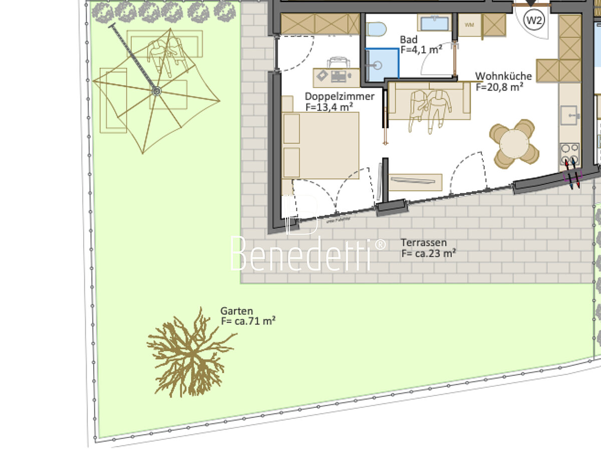 L’appartamento W2 si trova al piano terra di una moderna nuova costruzione composta da sole sei esclusive unità abitative. L’accesso avviene in modo discreto dal piano interrato, garantendo un elevato livello di privacy. Il progetto architettonico combina elementi tradizionali con linee moderne, integrandosi armoniosamente nell’ambiente circostante. L’appartamento dispone di un giardino privato di circa 71 m² e di una terrazza di circa 23 m² – luoghi ideali per il relax all’aperto. La distribuzione degli spazi crea, su circa 38 m² di superficie abitabile, un’atmosfera accogliente con un soggiorno/pranzo open space, una camera matrimoniale e un bagno moderno. Posto auto a partire da € 22.000.