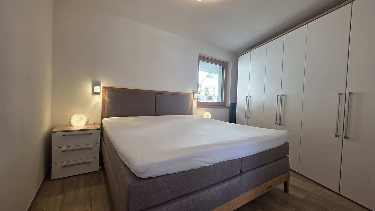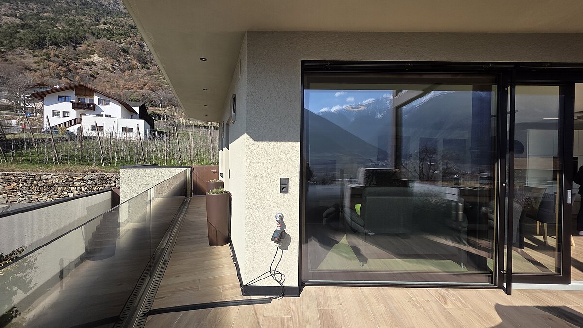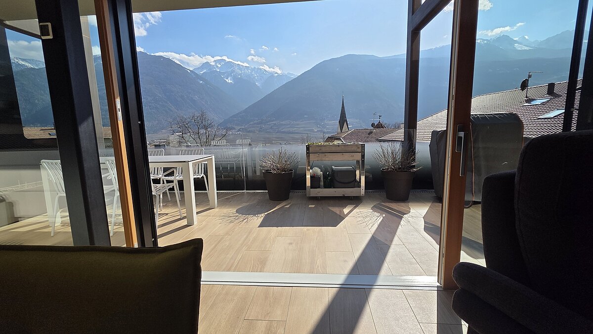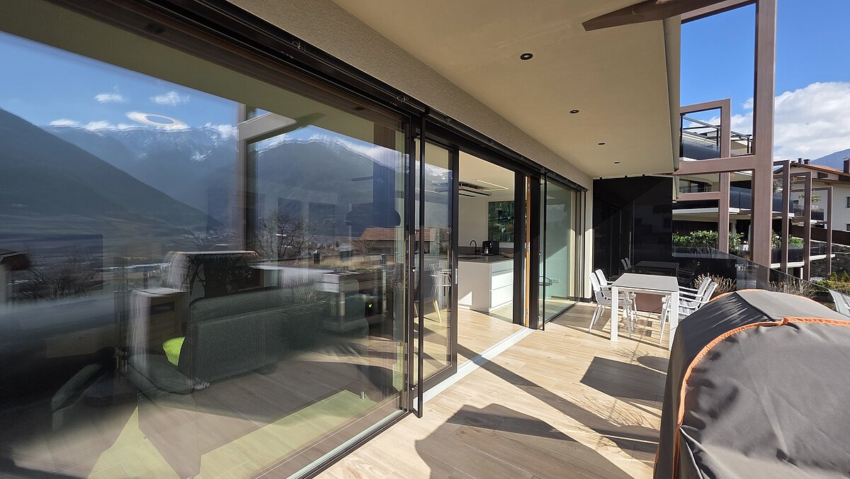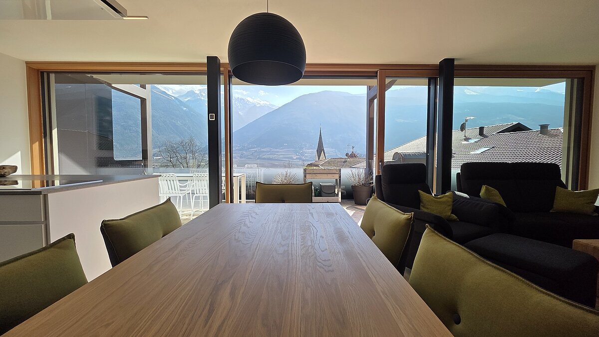 Il cuore dell’abitazione è rappresentato dal luminoso soggiorno con cucina moderna. Ampie vetrate garantiscono molta luce naturale e creano un armonioso collegamento con la generosa terrazza esposta a sud. Da qui si gode di una vista spettacolare sulle montagne e sulla natura circostante. La terrazza offre ampio spazio per piacevoli momenti all’aperto e rende la vita all’esterno un’esperienza particolarmente piacevole.