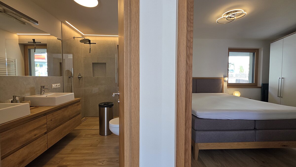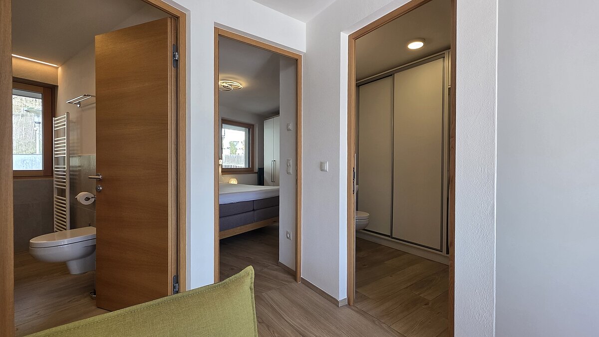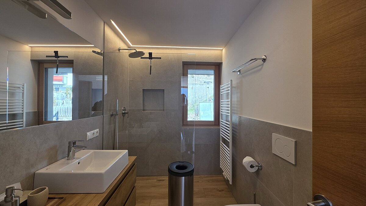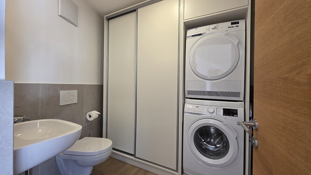 Il bagno moderno convince per il suo design contemporaneo. Inoltre è presente un pratico ripostiglio con angolo lavanderia, nel quale è integrato anche il WC per gli ospiti, combinando così funzionalità e comfort in modo ottimale.
