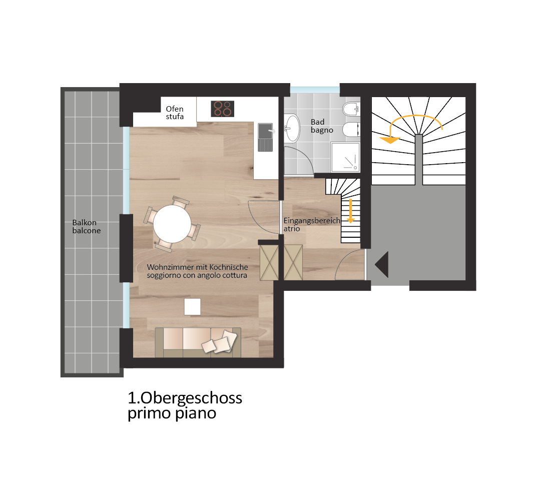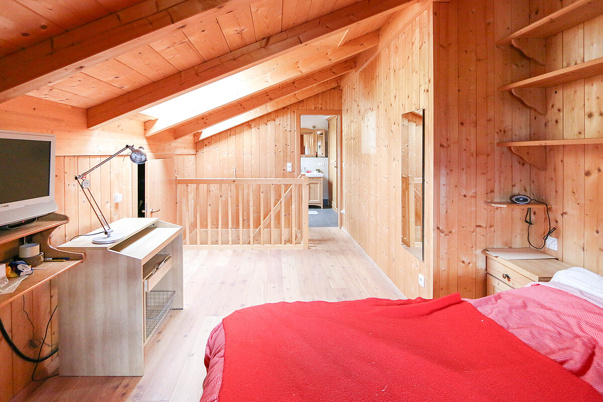 Al primo piano si trovano un accogliente ingresso, un bagno luminoso e un’ampia cucina-soggiorno con zona notte separabile. Al piano superiore si trovano una camera da letto aggiuntiva, un secondo bagno moderno e una soffitta spaziosa. Completano la proprietà una cantina e un garage, che offrono ulteriore comfort.