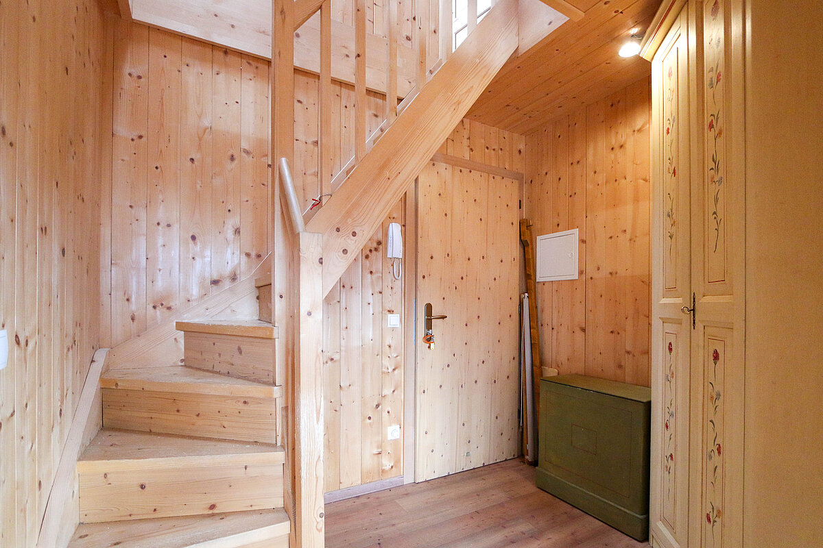 L’appartamento colpisce per il suo stile tirolese tradizionale, caratterizzato da pregiati elementi in legno che creano un’atmosfera calda e accogliente. La stufa a legna diffonde un piacevole tepore nelle giornate più fredde e sottolinea il carattere alpino di questa proprietà unica. Dal balcone soleggiato si gode una vista panoramica mozzafiato sulle montagne circostanti.