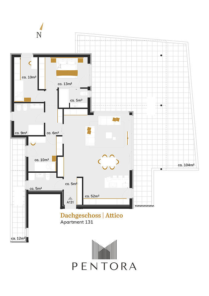 Suddiviso in soggiorno con cucina, 3 camere e 3 bagni